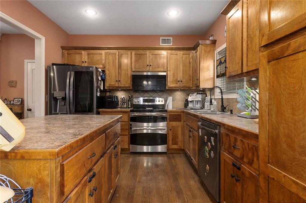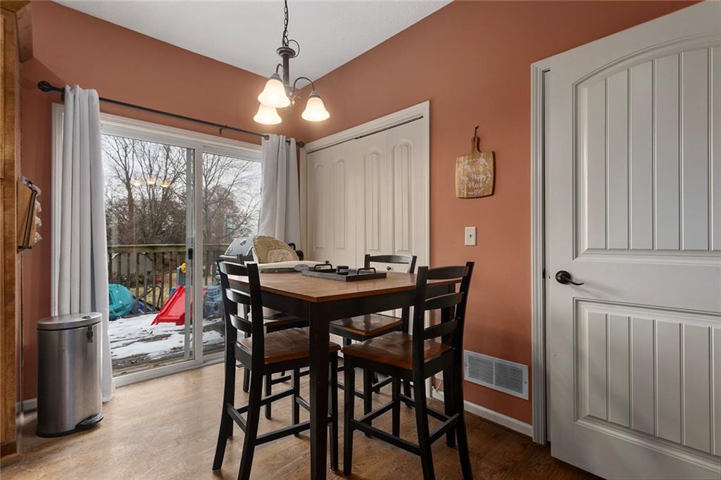 Absolutely CHARMING! This home stands out! Beautiful color and structure outside! INSIDE: A lovely, welcoming living room! Here you will find a working gas fireplace, ceiling fan, unique wall cabinet, and a door to the garage. In the kitchen, there are medium-toned Shaker-style cabinets and a tile backsplash. Stainless steel appliances, nice hardwood floors, an island, room for a table, and a laundry area with a double door opening. A half-bathroom with built-in cabinets is conveniently located on the main floor. Looking out the sliding doors, you see a nice-sized yard with a large deck and a shed that stays. The main floor also boasts the Primary Bedroom with lots of natural light, a ceiling fan, a modern feel, and an ensuite bath with shower/tub combo. As you ascend to the second floor, note the stylish wooden handrail. These stairs lead to two very distinctive bedrooms, each with a ceiling fan, one large window, and one window in a nook. So INVITING and cozy! Upstairs bedrooms share a full bath with a shower over the tub. The basement is partially finished and offers so many creative ways to use the space! There is a vinyl floor, a storage area, an almost finished full bathroom, a BONUS room, and a STUDIO room with noise-cancelling drywall. Nice, 2-inch blinds throughout this home show very nicely, and the lighting throughout is just outstanding! This is such a stylish home! Come and see it TODAY!