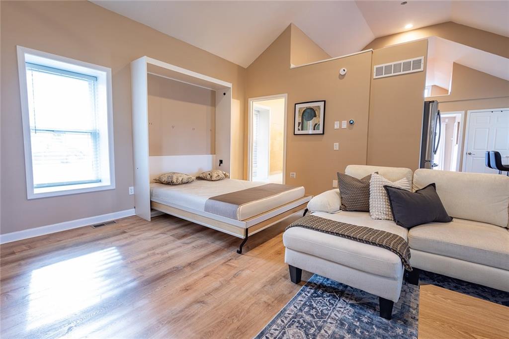 Discover a home you simply don’t see every day — a peaceful Kansas City bungalow offering character, updates, and a rare nearly-acre lot backing to trees. Just minutes from the KC Zoo, Starlight Theatre, Arrowhead Stadium, and major highways, this location makes daily life effortless — whether you’re commuting, catching a show, or heading downtown. Inside, the home welcomes you with new luxury vinyl flooring and an inviting living area that includes a built-in Murphy bed for flexible guest space. A loft tucked above offers additional storage, potential extra sleeping space, or other creative uses — giving you options most homes this size don’t provide. The kitchen shines with quartz countertops, a bar/island, gas range, newer stainless steel appliances, and plenty of room to cook and gather. The bathroom feels like a retreat with a large walk-in shower, double vanities, and in-unit stackable laundry. The bedroom is generously sized and includes a spacious closet and French doors! Outside, you’ll love what makes this home truly special: nearly an acre of land and a covered front porch backing to mature trees, creating uncommon privacy and room to enjoy the outdoors! Newer HVAC, Water Heater, and Appliances, as well as keyless entry, smart thermostat, and Wi-Fi camera system add to everyday ease and peace of mind. Updated, unique, and unexpectedly private — this home delivers more than meets the eye. Seller is Owner/Agent