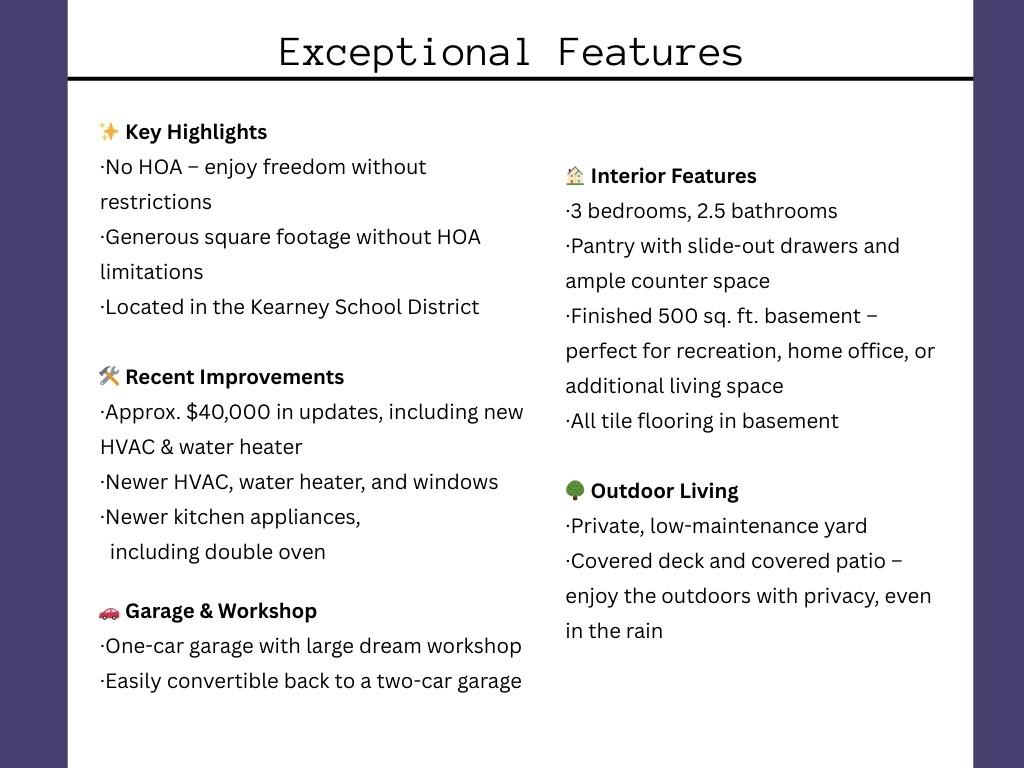 No HOA! Located in the highly sought-after Kearney School District, this home offers approximately $40,000 in recent improvements, including a new HVAC system, water heater & newer kitchen appliances all staying. Featuring 3 bedrooms and 2.5 bathrooms, plus a finished 500 sq. ft. basement with all tile flooring—perfect for recreation, a home office, another bedroom or additional living space. Enjoy a private, low-maintenance yard with both a covered deck and covered patio, providing year-round outdoor enjoyment and privacy—even on rainy days. The property includes a one-car garage with a large dream workshop + shed, easily convertible back to a two-car garage if desired. Modern finishes throughout make this home move-in ready. If you’re looking for generous square footage without HOA restrictions, this is the perfect place for you!