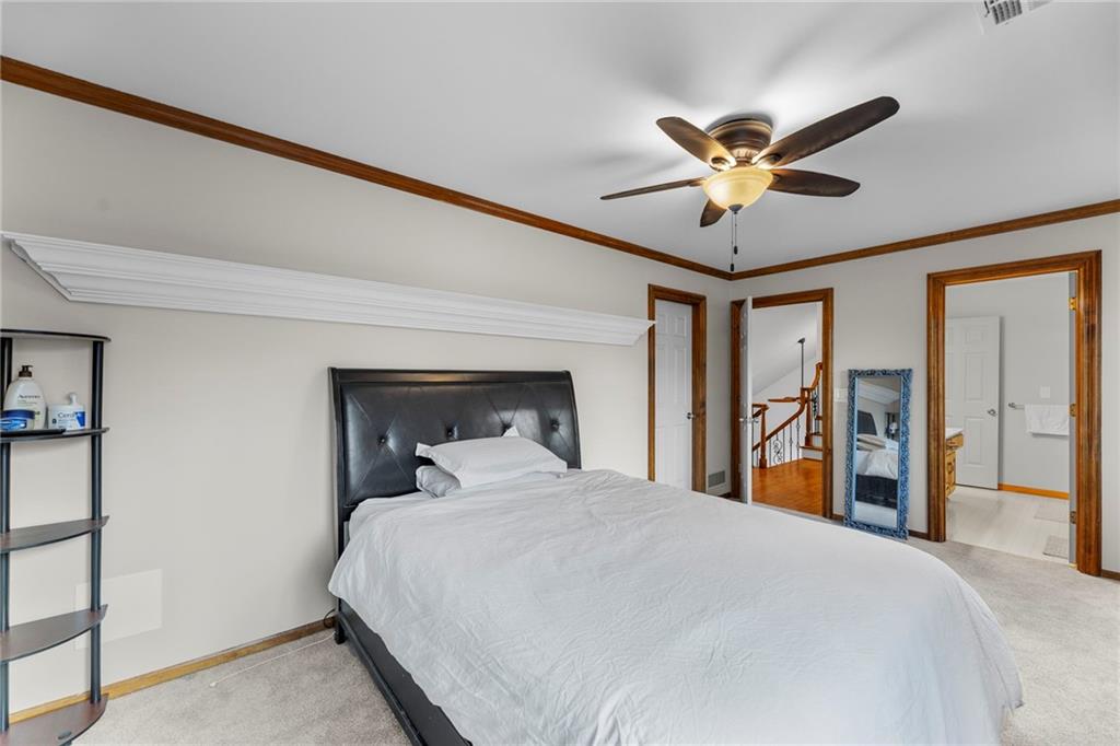 DON'T MISS OUT on an opportunity to own this fantastic 2-story home in a highly sought-after Overland Park neighborhood in Blue Valley schools! From the moment you step inside, you’re immediately greeted by a beautiful staircase & a huge family room with soaring two-story ceilings, creating an open & inviting atmosphere. Just beyond the family room, relax in the warm and welcoming hearth room boasting a beautiful brick fireplace, dramatic 10-foot beam-accented ceilings, and oversized windows overlooking a spacious, park-like backyard. The abundance of windows along the back of the home fills every space with natural light. The open-concept design flows into the dining area and a huge kitchen, complete with granite countertops, stainless steel appliances, a large center island, and generous cabinet and countertop space, perfect for both everyday living and entertaining. Adjacent to the kitchen is a convenient laundry room and a half bath for guests. Step out from the kitchen onto a huge over-sized deck with a pergola, ideal for outdoor dining, relaxing, or summer barbecues. The backyard is fully fenced and generously sized, offering plenty of room to play, garden, or entertain. Upstairs, you'll find a luxurious primary suite, two additional bedrooms and a hall bathroom. The primary suite provides a true retreat with a beautifully updated en suite bathroom featuring dual vanities, a jacuzzi tub, walk-in shower, and an expansive walk-in closet. Two additional bedrooms and a full hall bath offer ample space for family or guests. The second-story landing overlooks the impressive family room below, adding to the sense of space and light throughout. The finished basement is ideal for a second recreation area, entertaining, or relaxed living, plus it offers substantial storage space. Enjoy the outdoors with parks and trails nearby, and benefit from convenient proximity to great restaurants and shopping. This home is ready for you to move in and make it your own. A MUST SEE!