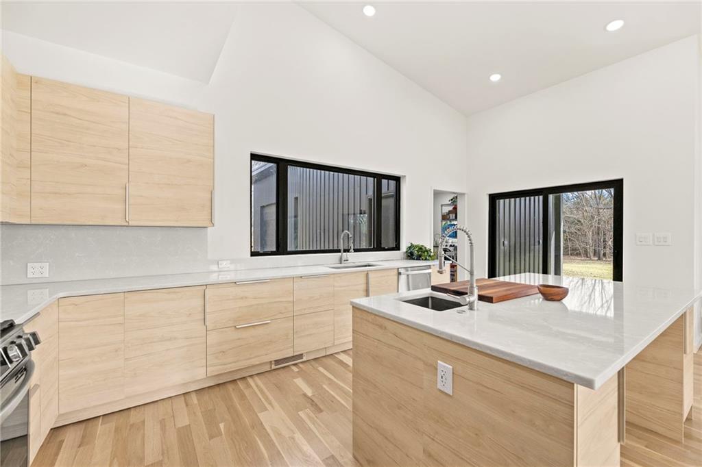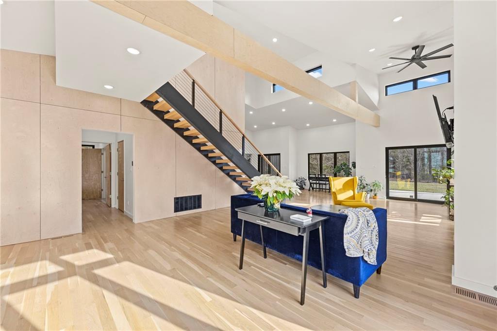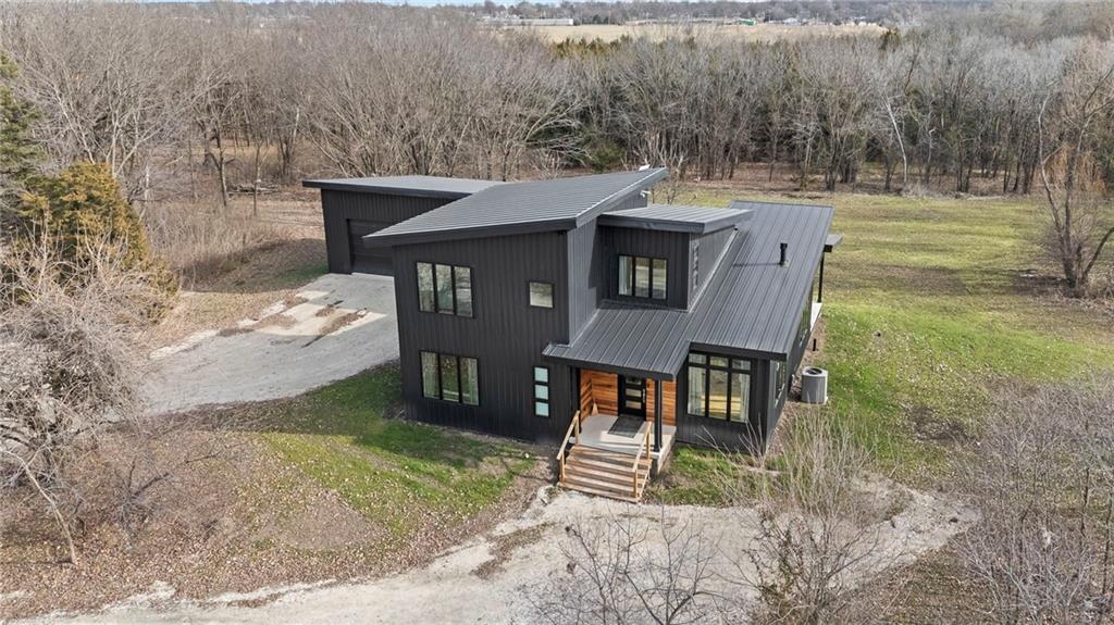 Discover a truly one-of-a-kind new construction set on 9.5 private, wooded acres, offering peaceful seclusion just 0.2 miles from the city limits on a paved road. This custom-built modern home pairs clean architectural lines with warm natural materials, creating a light-filled, open-concept design with soaring ceilings. Built for longevity and efficiency, the home features 2x12 floor joists and 2x6 exterior walls, along with expansive dual low-E Pella Impervia insulated windows that flood the interior with natural light. White oak hardwood floors extend throughout the living areas and bedrooms, complemented by a striking floating staircase with thick white oak plank steps. The thoughtfully designed layout includes three bedrooms, two and a half bathrooms, and a spacious 1,000+ sq. ft. attached two-car garage with 10-foot garage doors. Bathrooms and the large laundry/mudroom are finished with durable tile flooring for everyday practicality. At the heart of the home, the chef-ready kitchen showcases premium finishes and a large island that seamlessly connects to the dining and living spaces—ideal for both daily living and entertaining. The main-floor primary suite offers a private, serene retreat, while additional rooms flex easily as guest suites, a home office, or creative studio. Indoor-outdoor living is emphasized through access to a covered patio overlooking quiet forest views, perfect for morning coffee or relaxing evenings under the stars. Despite its private setting, the property is fully connected to city water, gas, and electrical services, blending modern convenience with acreage privacy. This exceptional property offers a rare combination of modern design, superior craftsmanship, and natural surroundings—a lifestyle opportunity seldom to be found. Schedule your private showing today.
