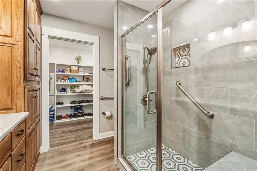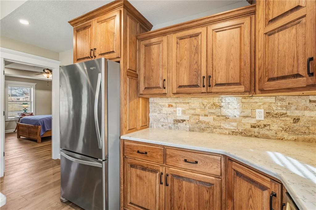 Easy Living, Elevated Style~ Welcome Home! Say hello to modern comfort made easy in this beautifully designed, newer-construction 2 bed, 2 bath, ranch home where style meets accessibility. Thoughtfully built for effortless living, this home invites you in with no-step entry, wide open spaces, and a layout that simply works for today’s lifestyle. Inside, natural light fills the open-concept living area, highlighting vaulted ceilings, a cozy travertine stone fireplace, and high-end finishes throughout. The stunning kitchen is a showstopper, featuring Amish-made custom cabinetry, a travertine backsplash, Quartz countertops, stainless steel appliances with an induction cooktop, and a large island perfect for gathering, entertaining, or everyday meals. The primary suite offers a spacious ensuite and walk-in closet, while the second bedroom is ideal for guests, a home office, or hobbies. Every detail was designed with comfort and convenience in mind, from custom cabinetry throughout to energy-efficient systems and added gutter guards. Step outside and enjoy a private patio, a fully fenced backyard perfect for furry friends, and a side yard with room to garden or unwind, on a nice corner lot. The attached 2-car garage offers room for storage, and yes, washer and dryer stay! Accessible, low-maintenance, and absolutely inviting, this home is ready for you to move in, relax, and fall in love.