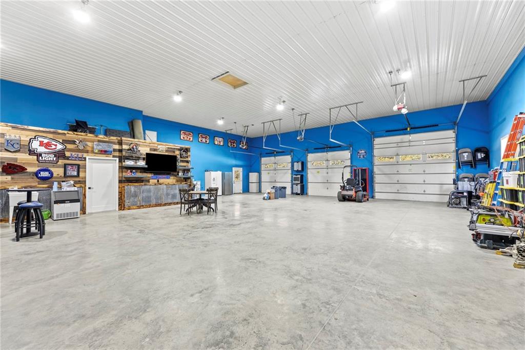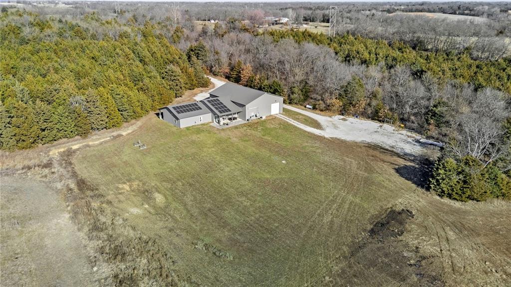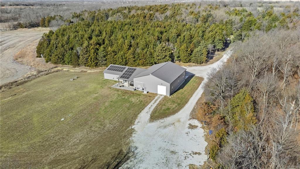 This absolutely stunning, custom-built 2021 barndominium offers the ultimate in secluded luxury across 20+ acres of gorgeous timber and pasture, greeting you with a sprawling covered porch perfect for taking in the abundant local wildlife. The interior showcases the finest craftsmanship through an open-concept layout defined by soaring ceilings, luxury vinyl flooring, and expansive walls of windows that flood the home with natural light. At the heart of the residence sits a gourmet kitchen featuring granite countertops, a massive island, custom cabinetry with pull-out drawers, and a 9x8 walk-in pantry with outlets, all flowing seamlessly into a dining area and a great room anchored by a cozy rock gas fireplace. Practicality meets style in the spacious mudroom, flanked by a dedicated laundry area and a convenient half bath, while the private primary suite serves as a true retreat with its tiled shower, deep soaker tub, and walk-in closet. Two additional generous bedrooms and a full bath provide ample space for family or guests, while a fully concrete 10 x 10 safe room ensures peace of mind. The home's technical specifications are equally impressive, featuring a sophisticated solar energy system supported by a propane gas generator and battery storage for total self-sufficiency. Covered back patio, great for entertaining. Completing this exceptional property is a 50x64, fully insulated, and sheet rocked garage/shop equipped with 200 AMP service, three overhead doors, an exit door, and dedicated attic storage—all situated on a prime piece of land ideal for hunting, farming, or recreation.