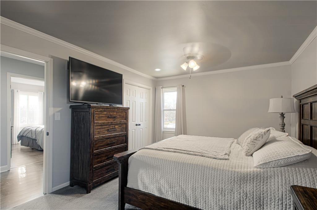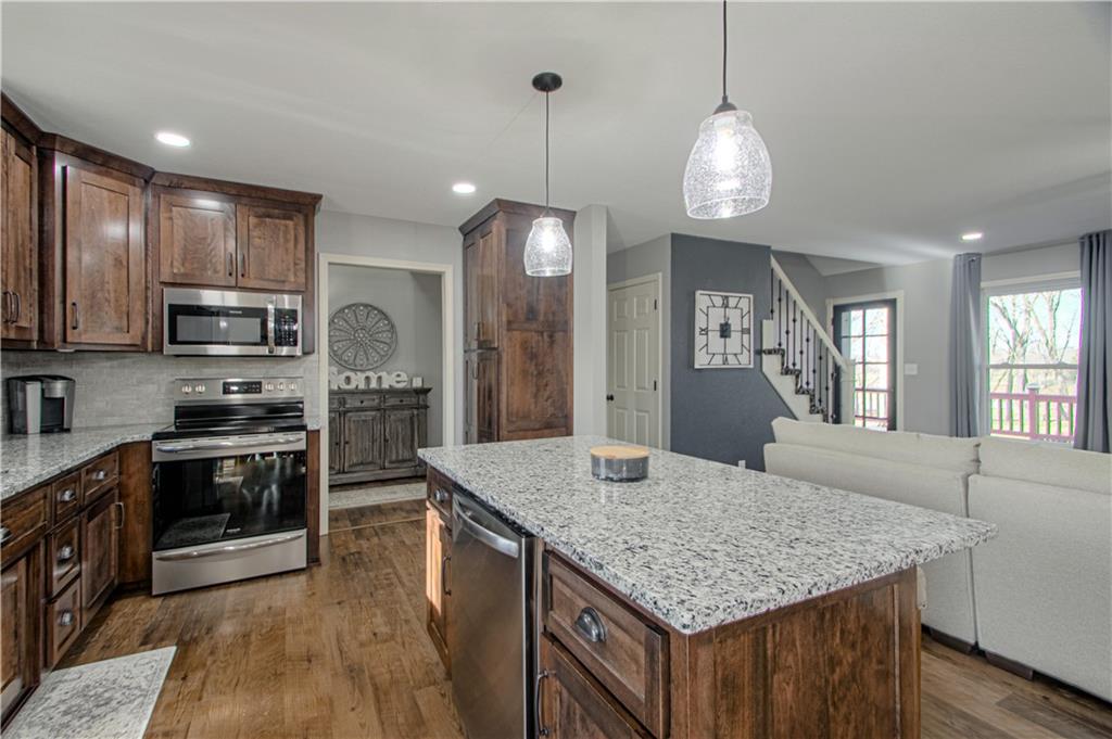 This home is impeccable! The owners have taken great care of it, remodeling the great room and kitchen with new cabinets, flooring, appliances, and an electric fireplace. The majority of the windows are newer, and the home has fresh paint and beautiful landscaping. The property itself is stunning, featuring an impressive two-level barn that measures 28x32 feet, surrounded by views of pecan, walnut, and oak trees. You can relax on the newly treated deck and enjoy watching the wildlife. The roof and heat pump are both under 10 years old. The side-entry garage is spacious, with one stall measuring 32 feet wide by 27 feet deep, and a second stall that is 24 feet deep. Dogwood Elementary and Kearney High School serve the home. Additionally, it's conveniently located near the Kearney Jesse James Fairground. Please note that the square footage, taxes, and other information should be verified by the buyer's agent.