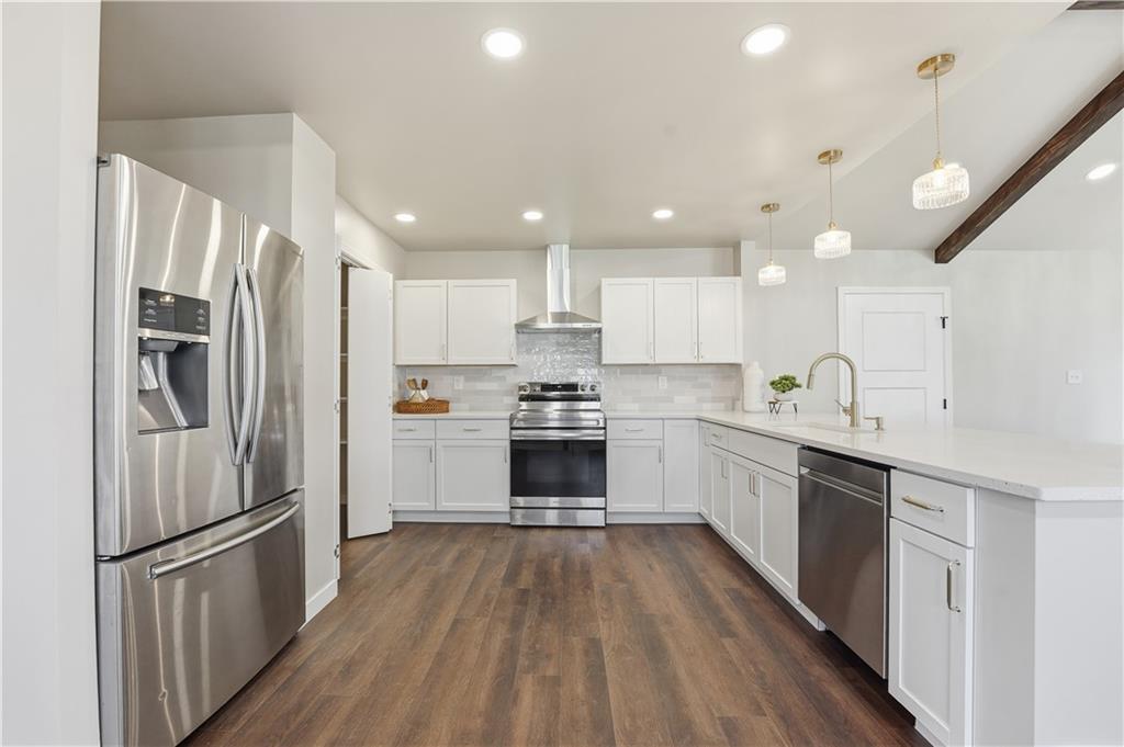 Welcome to this fully renovated split-level home, completely transformed from top to bottom and tucked into a quiet, established neighborhood with mature trees. The main level is bright and open with vaulted ceilings, exposed wood beams, and a comfortable living space that flows into the dining area and updated kitchen featuring ALL brand-new stainless steel appliances, white cabinetry, and modern finishes. Just off the main living area, a large sunroom offers additional space to relax or entertain. Upstairs, you’ll find well-sized bedrooms, including a primary suite with its own bathroom, plus an updated hall bath. The laundry is conveniently located on this level, right next to the bedrooms, making everyday living easy. The finished lower level adds valuable flexibility with a second living space, a full bathroom, and a spacious non-conforming 4th bedroom with a walk-in closet. With private exterior access, this area works well for guests, a home office, or additional living space. Additional features include updated flooring throughout, modern fixtures, ample storage, a two-car garage, and a rear deck overlooking the yard. Located just minutes from North Kansas City Hospital and approximately 10 minutes from Downtown Kansas City, this home offers quick access to city amenities while still feeling removed from the busy city life. Move-in ready and thoughtfully renovated throughout, this home is truly unrecognizable from its original condition and offers a functional layout, great location, and flexibility to fit a variety of lifestyles.