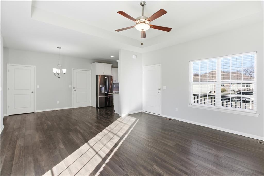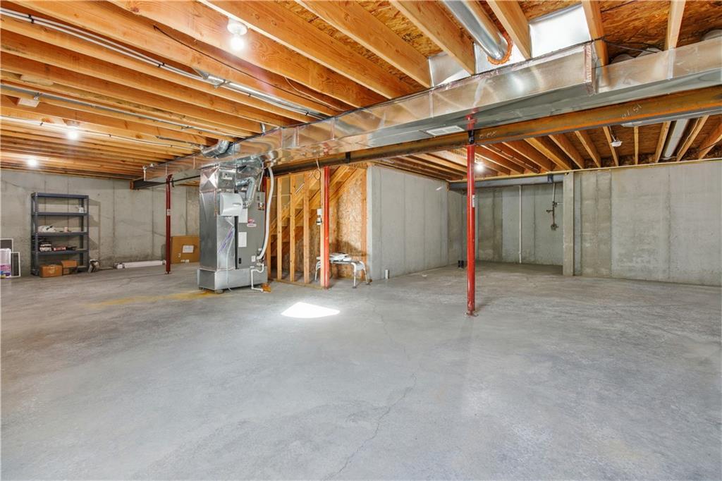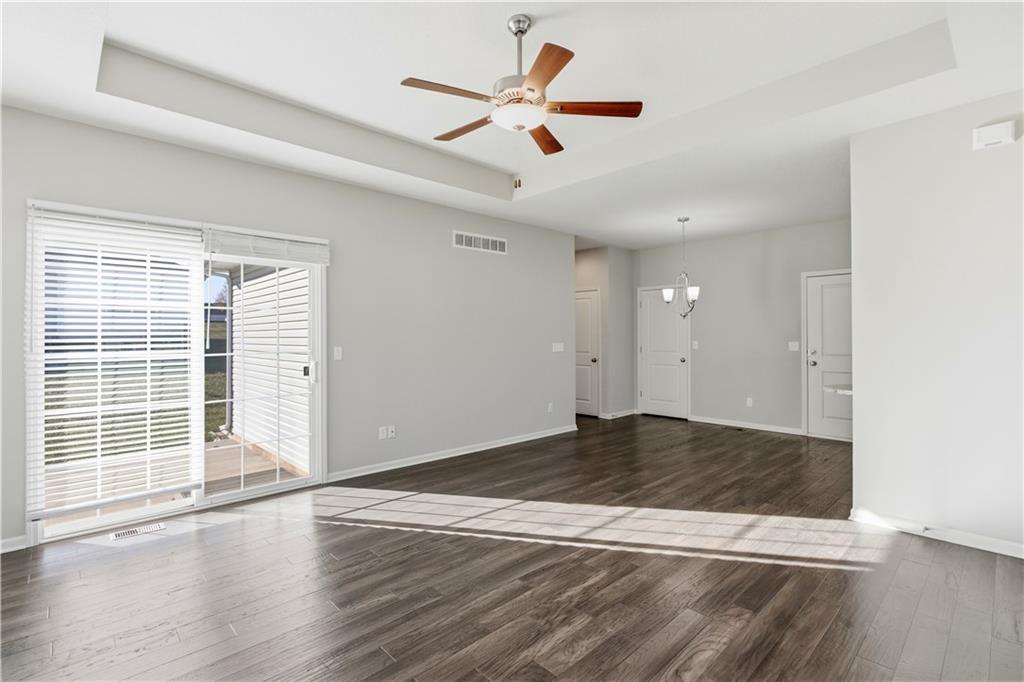 Welcome to maintenance-free living in this 55+ community home, ideally located just one mile from The Legends and Village West shopping district—soon to be the hub for all Kansas City sports! Open floor plan w/ beautiful hardwood floors throughout the main living areas. The spacious great room boasts a large vaulted ceiling, creating an airy and inviting atmosphere. The kitchen offers plenty of cabinet space, granite countertops, a pantry, and a full stainless steel appliance package. The primary bedroom is generously sized with its own vaulted ceiling, a walk-in closet, secondary closet and a private bath complete with a large shower. Both bathrooms feature ceramic tile floors for easy maintenance. Enjoy relaxing evenings on the nice back patio or the front charming country porch. The large two-car garage provides plenty of parking and storage space. This energy-efficient, all-electric home is equipped with heat pumps for year-round comfort. Plus, a HUGE unfinished full basement offers endless possibilities for additional living space or storage.