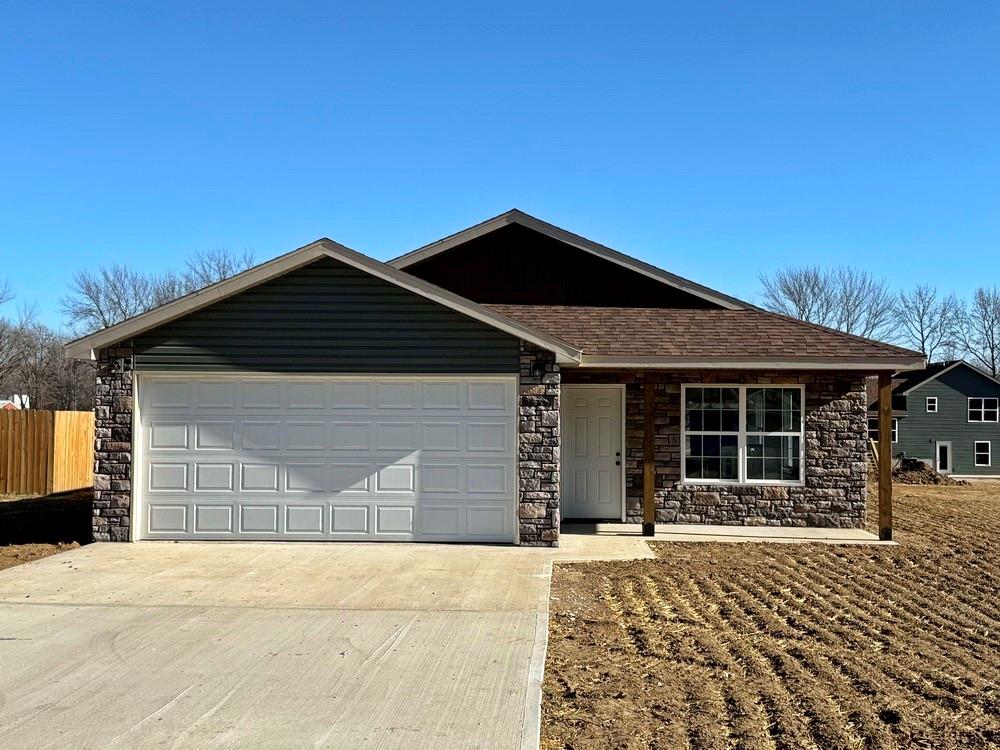 New-Construction Ranch Home in El Dorado Springs: This new-built home, located in a beautiful neighborhood on the south side of El Dorado Springs, will be ready for its first owner in January 2026. The 1,401 sq ft home sits on a level .26-acre lot surrounded by a neighborhood of newer homes. The maintenance free exterior showcases an attractive combination of siding and stone and accented by a front patio and a back BBQ/coffee patio. The main living space is a combination of the living room, dining room, and kitchen that is perfect for entertaining and allows for tons of natural lighting with 2 west-facing windows and 3 south-facing windows. The custom cabinets, with soft-close doors and drawers, granite counter tops, kitchen island, LED lighting, and new black appliances make this a top-tier and attractive kitchen. There are 3 bedrooms and 2 bathrooms with one bathroom ensuite to the master. A 2-car garage is attached. This home has no steps, a 1-year builder’s warranty, low maintenance, and a perfect location for walking, biking, and quick errands to town. Call today and schedule a private showing as the final touches are being finished on 1803 S Elm St in El Dorado Springs.