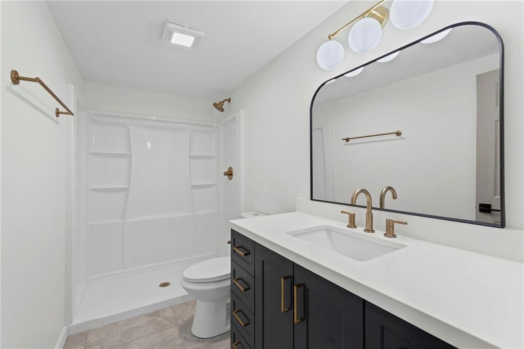 Beautifully remodeled California Split level home backing to neighborhood trail and pond! ALL NEW: Roof, Kitchen, Baths and MORE! Fresh interior and exterior paint pair perfectly with new floors. Inviting, light and bright Great Room features cozy fireplace for these chilly months. Please the chef in this kitchen with new cabinets, quartz countertops, center eat-in island, pantry and new stainless steel appliances! Adjacent dining area accesses the deck to easily move outdoors! Also on this level find two bedrooms, second full bath and convenient laundry! Head up to the Primary Retreat showcasing tray vault ceiling, walk-in closet and a private en-suite including double vanity, spa bath and separate shower! Finished, walk-out lower level has a family room, fourth bedroom and third full bath. Unfinished basement for additional storage needs. All of this in a fantastic location just minutes to all the activities at the Legends and easy highway access to enjoy everything the Metro has to offer. WELCOME HOME!