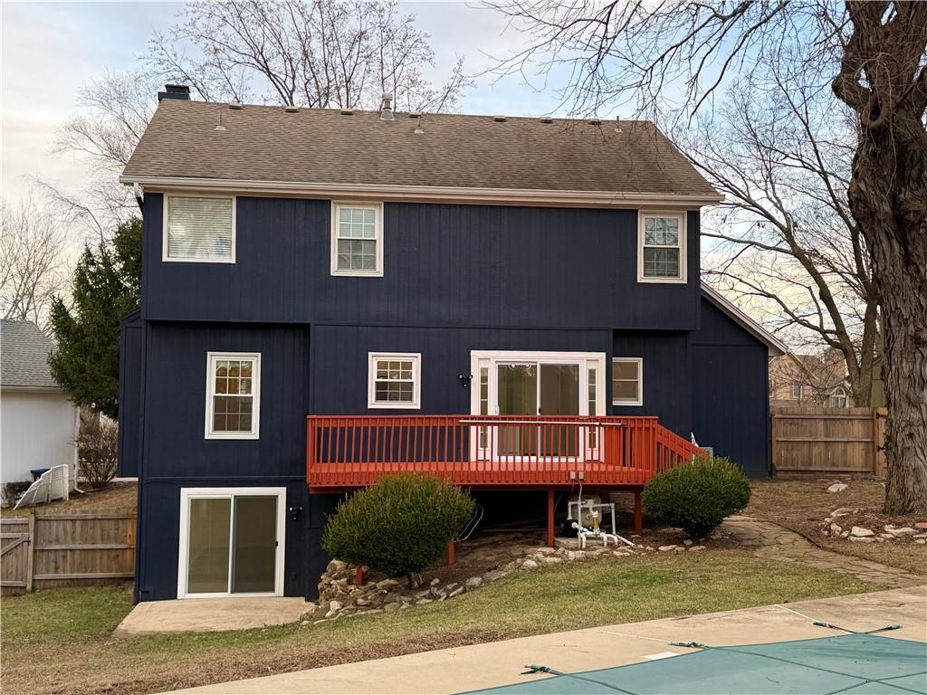 Tucked away on a cul-de-sac in the sought-after Blue Valley school district, this Willow Bend beauty is centered around a truly exceptional outdoor retreat. Set on a lush, .36-acre treed lot with fenced backyard featuring a beautiful in-ground pool surrounded by an expansive patio—perfect for summer gatherings, morning swims, or relaxing evenings under the trees. The deck overlooks the serene backyard and pool, offering the ideal space for dining, hosting, or simply unwinding. Inside, the home continues to impress with a welcoming great room showcasing a brick fireplace framed by built-in bookshelves. The kitchen has been completedly updated with white cabinetry, quartz countertops, a large island, stainless steel appliances, and pantry. The finished walkout lower level is designed with entertaining in mind, providing direct access to the pool and lower patio. The primary suite offers a walk-in closet and spa-inspired bath highlighted by marble countertops, dual vanity, tile floors, a corner whirlpool tub, and a stylish sliding barn door that adds warmth and privacy. Additional highlights include updated windows, newer garage doors, and updated lighting. Move-in ready as washer, dryer and refrigerator all stay! Close to Bluhawk, restaurants, shopping, schools, and parks. Green Meadows and Creekside park with trails, creek, green space, two playgrounds, and picnic shelter is just a short walk down the street. Don’t wait on this one!