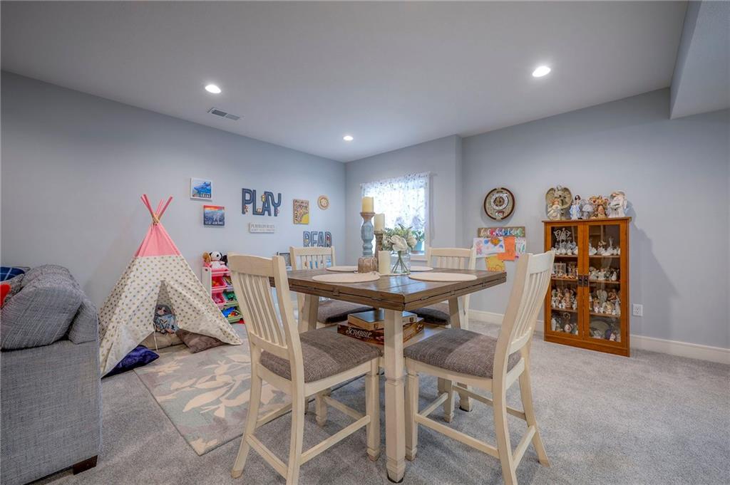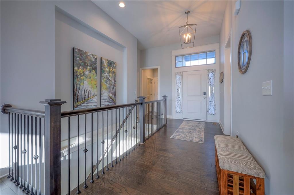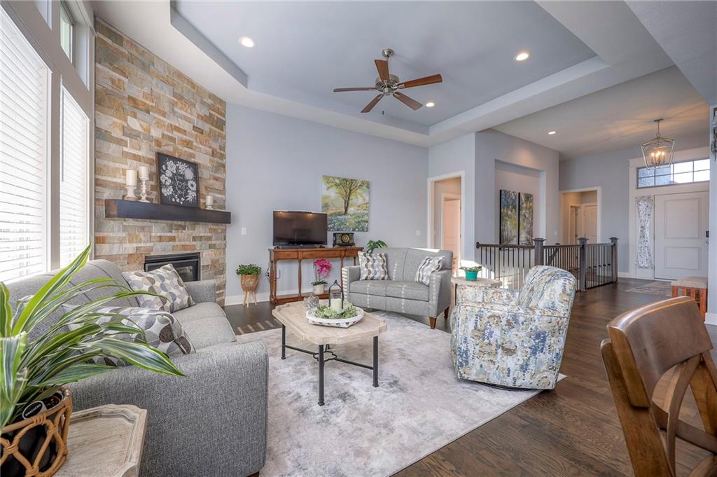 Why wait for new construction! This pristine home has a recently added screened-in patio and interior blinds. The Prescott plan by Crestwood Custom Homes boasts 10' ceilings in the entry & great room and so much natural light from the great room wall of windows. Hardwood floors throughout the entry, great room, kitchen and breakfast room. The kitchen has large island with quartz counter tops, custom cabinets, gas cooktop, built in oven & microwave, and a walk-in pantry. The spacious great room offers floor to ceiling stone fireplace. The primary bedroom/bath feature a large walk-in closet, double vanity, an oversized zero entry walk-in shower and a free standing tub. Easy access to the laundry room directly from the master closet. Additional bedroom and full bath on the main floor. Finished lower level is the perfect entertaining space with large family room, walk up bar with mini refrigerator, sink, and granite/quartz countertop. There are also 2 additional bedrooms - one with double doors (great for exercise room or office) and an additional full bath in the lower level. Enjoy your morning coffee relaxing on the covered screened-in patio. Your quarterly HOA dues cover yard work, snow removal, exterior painting, winterization of irrigation, and common ground maintenance. The home is close to shopping, restaurants and highway access. Don't miss the opportunity to make this impeccably maintained house your next home!
