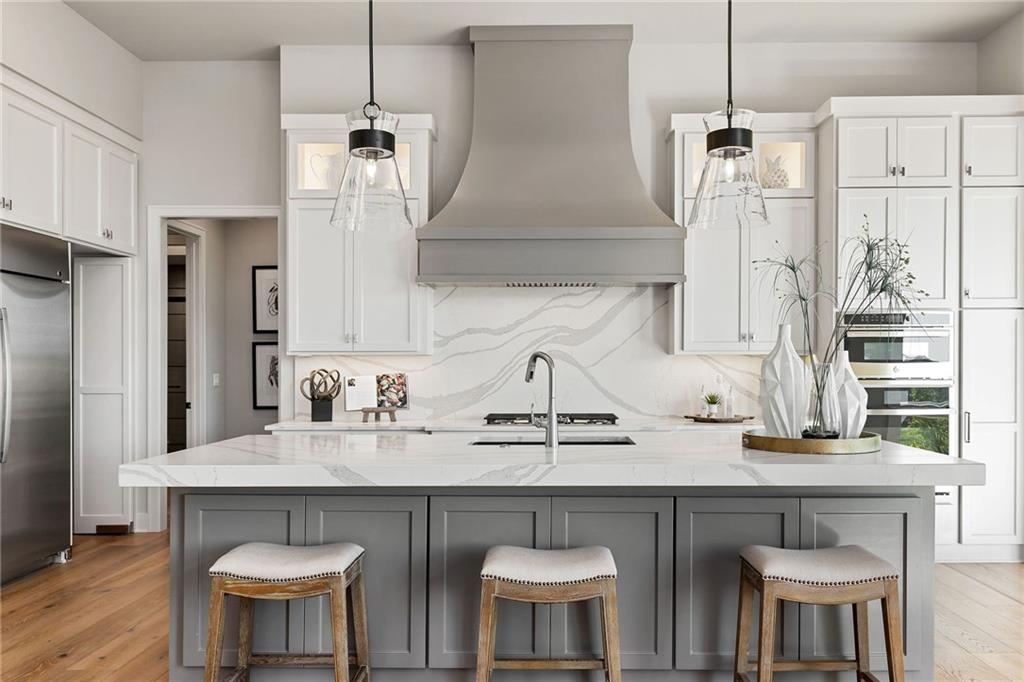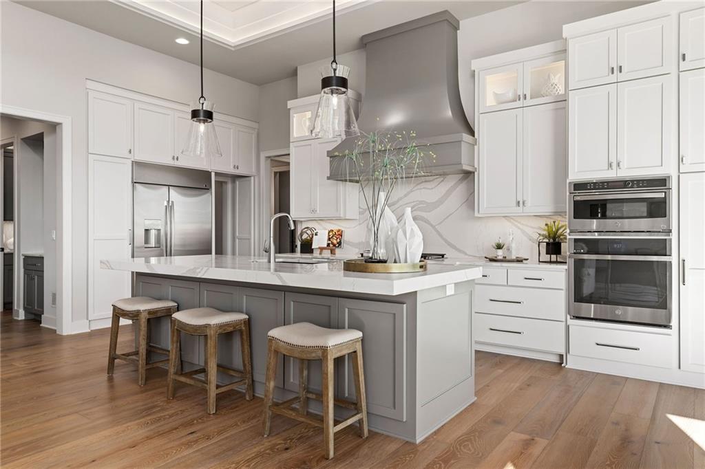 The highly sought-after Mustang plan by Willis Custom Homes is now underway at REGENTS PARK in Leawood on premier walkout Lot 1, with an estimated completion in Fall 2026. This reverse 1.5-story home blends timeless architecture with a livable layout designed for both everyday comfort and entertaining. Upon entry, a striking two-story feature wall along the staircase creates a strong architectural moment while maintaining a clean, spacious entry. The main level is anchored by a great room featuring three box-vaulted ceiling details with custom trim and cove lighting, adding depth and volume to the heart of the home. The kitchen flows seamlessly into the dining area and great room, while a generously sized pantry and convenient garage entry enhance daily functionality. Just off the kitchen, a flexible main-level room with sliding doors provides direct access to the covered deck—ideal for a home office, guest space, or additional living area. The covered deck features a fireplace and stairs leading down to the backyard, extending the living space outdoors and taking full advantage of one of the community’s limited walkout lots. The main-level primary suite offers a private retreat with a spa-like bath and generous closet space. The finished walkout lower level is a true extension of the home, centered around a large entertainment room with a full bar, dedicated wine storage, game table area, and access to the covered patio. Additional bedrooms and bathrooms provide comfortable accommodations for guests or family. Regents Park is Leawood’s newest maintenance-provided luxury community, tucked behind the 135th Street corridor with shopping, dining, and entertainment minutes away. Amenities include a pool, pickleball court, dog park, and walking trails. HOA is $450/month. Photos are of a previously completed model; finishes will vary. Reach out for a full list of options and the opportunity to customize this home.