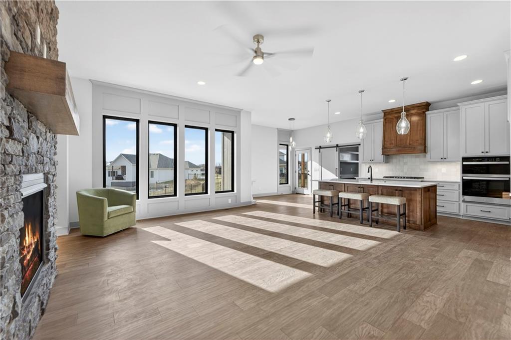 Situated on a premium, private lot backing to serene green space, trails, and a meandering creek, this Reverse 1.5-Story offers the perfect balance of modern luxury and everyday comfort. The thoughtfully designed 4-bedroom, 3-bath layout accommodates both peaceful mornings and effortless entertaining. The main level is anchored by a kitchen featuring sleek quartz countertops, custom cabinetry, a gas cooktop with striking statement hood, and a double-oven configuration with convection microwave. A pocket office is conveniently positioned nearby, while a well-planned mud zone and large pantry seamlessly connects the three-car garage for easy organization and daily functionality. Sunlight fills the great room as it flows into the primary suite, with the laundry thoughtfully located just steps away. A secondary main-level bedroom is privately tucked away—not immediately off the front entry—offering flexibility for guests or a more private home office. The walkout lower level is bright and inviting, designed for gatherings with a spacious recreation room, wet bar, and two generously sized bedrooms. Outdoors, enjoy the tranquility of a peaceful dead-end street with minimal neighbors, an expansive backyard, and an in-ground sprinkler system. Ideally located just minutes from shopping, dining, and entertainment along Adam’s Dairy Parkway, with quick access to I-70 for effortless commuting. Exceptional design, privacy, and convenience come together here—schedule your private tour and experience it for yourself.
