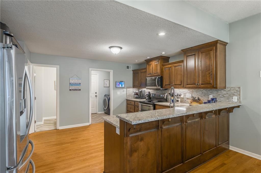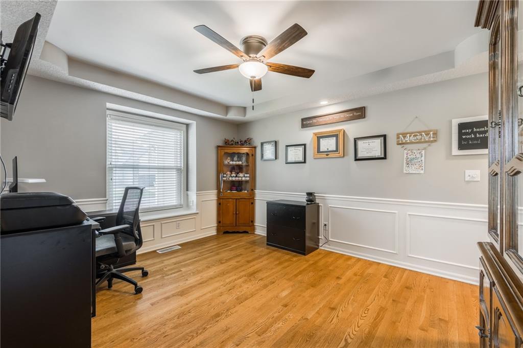 Beautiful and spacious 1.5-story in highly desirable Parkwood at Stoney Creek. Master bedroom and laundry on the main level for convenience. This home offers 5 bedrooms, 4 full baths, and 1 half bath with a 2-car tandem garage that comfortably fits 3 cars plus extra storage. Thoughtfully updated throughout in recent years with triple-pane krypton-filled thermal windows, a 2-year old roof, quartz countertops, stainless steel appliances including a double oven, and an abundance of cabinet space. Gorgeous hardwood flooring spans the main level, complemented by a newer 95%+ high-efficiency HVAC system. The main level primary suite features a whirlpool tub, double vanities, and a generous walk-in closet. Upstairs you’ll find 3 bedrooms—one with a charming loft and private bath—and a Jack-and-Jill bath shared between the remaining two. The fully finished, open lower level includes a wet bar, 5th bedroom, full bath, and walk-in closet. Enjoy evenings on the covered patio overlooking the yard, ideal for entertaining family, friends, and neighbors. Parkwood offers award-winning schools (LS West), three community pools, parks, and trash/recycling included in HOA. Schedule your showing today!
