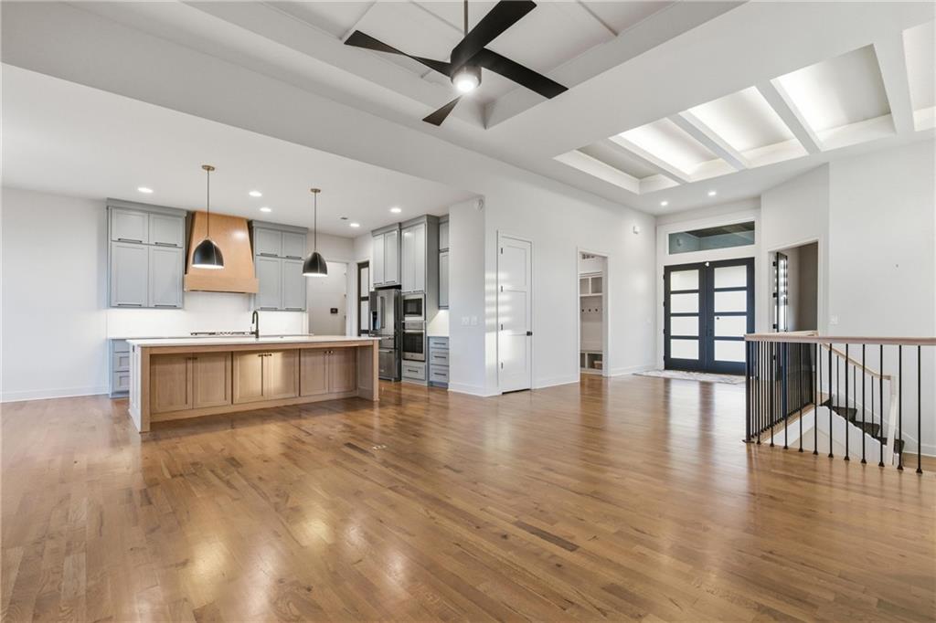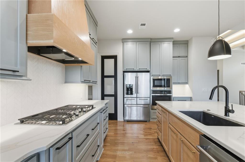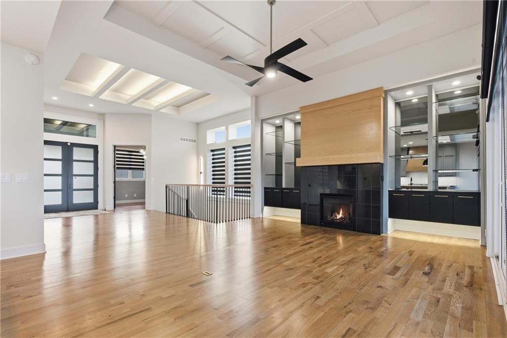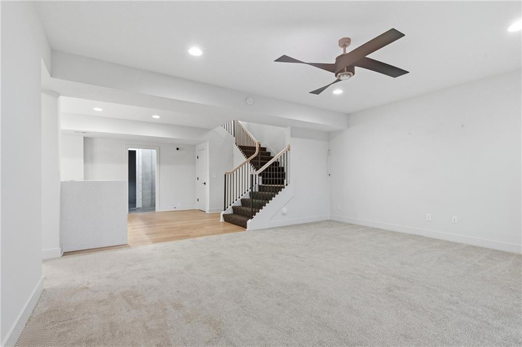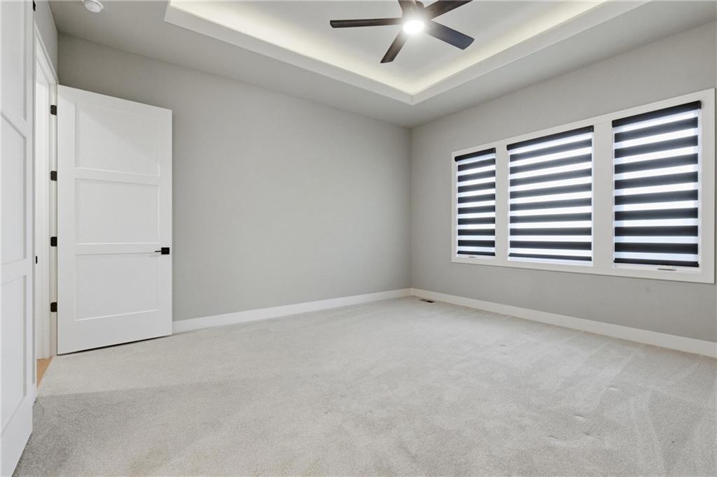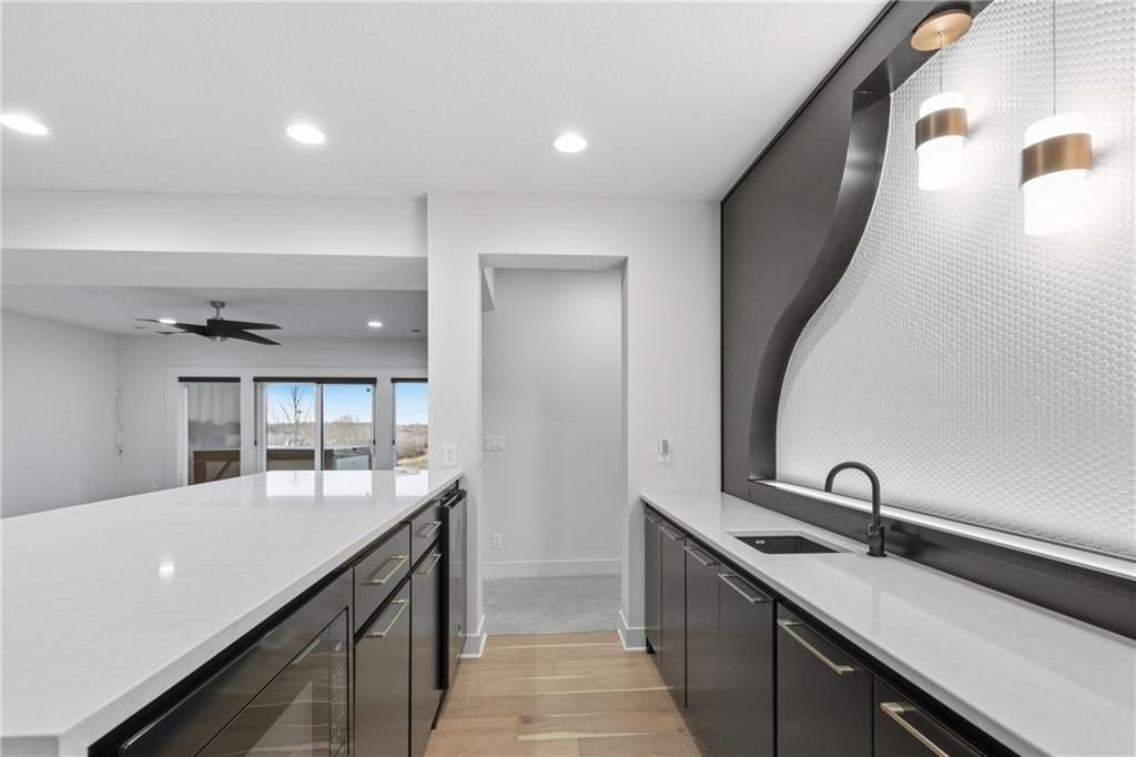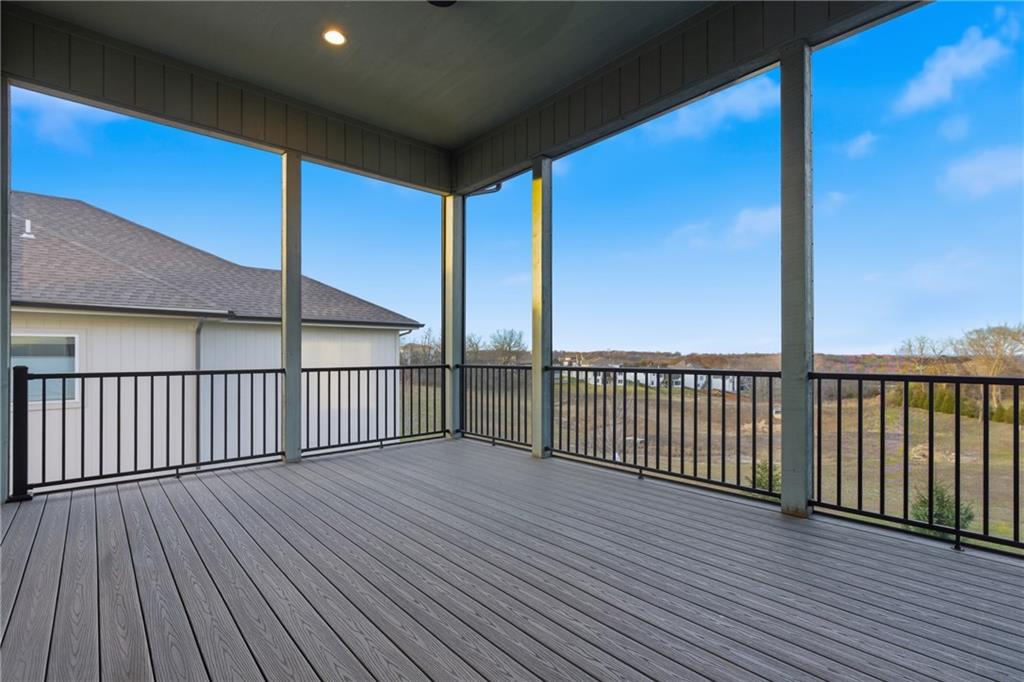 Built in late 2022 by the esteemed Don Julian Builders, this beautifully designed Reverse 1.5 story home is tucked within the premier Bristol Highlands Villas—where maintenance-provided living meets the peace and privacy of rolling hills and protected green space. Just minutes from Shawnee Mission Park, scenic trails and lakes, Lenexa City Center, dining, shopping, De Soto schools, and highway access—yet perfectly secluded—this home truly offers the best of both worlds. Thoughtfully designed for main-level living, the primary suite is a private retreat featuring separate vanities, luxurious soaking tub, walk-in shower with bench, and a spacious walk-in closet with direct access to the laundry room . A stylish powder room for guests and a dedicated office with double doors add both function and flexibility upstairs. The great room features custom built-ins, gas fireplace, and a seamless flow to the covered + screened deck overlooking tranquil green space with privacy! The kitchen—designed for entertaining and everyday living, showcases an oversized island with storage and seating, custom cabinetry to ceiling, quartz, and walk-in pantry. All SS appliances stay, including a newer KitchenAid dishwasher and high-end KitchenAid refrigerator! The walkout lower level is ideal for guests and gatherings, featuring a chic wet bar with beverage fridge, built-in microwave, and island. A cozy family room with slider access to the covered patio is perfect for movie night. One bedroom enjoys easy access to a full hall bath, while 2 additional bedrooms share a Jack-and-Jill bathroom with tub—perfect for hosting family & visitors. Features include high-efficiency HVAC, Lennox smart thermostat, ADT security, automatic privacy screens for the patio and deck, automatic blinds throughout, hardwood floors, and a coveted location backing to community green space. Low-maintenance living. High-end finishes. Don’t let this one pass you by—homes like this are truly special.