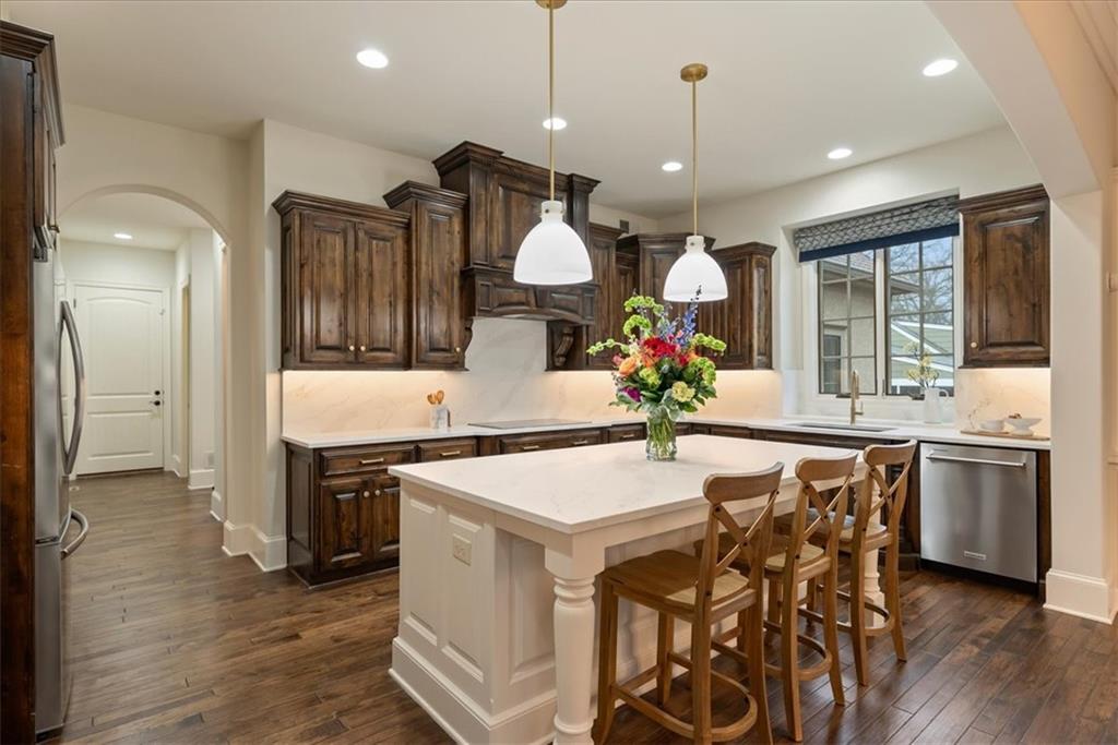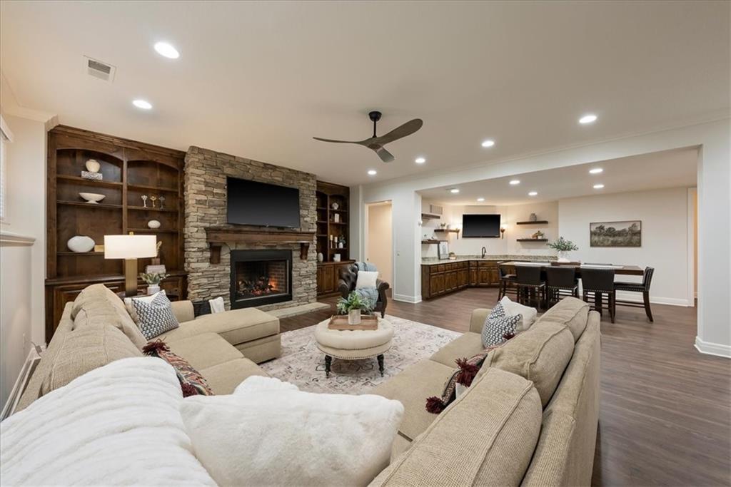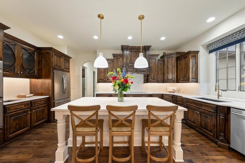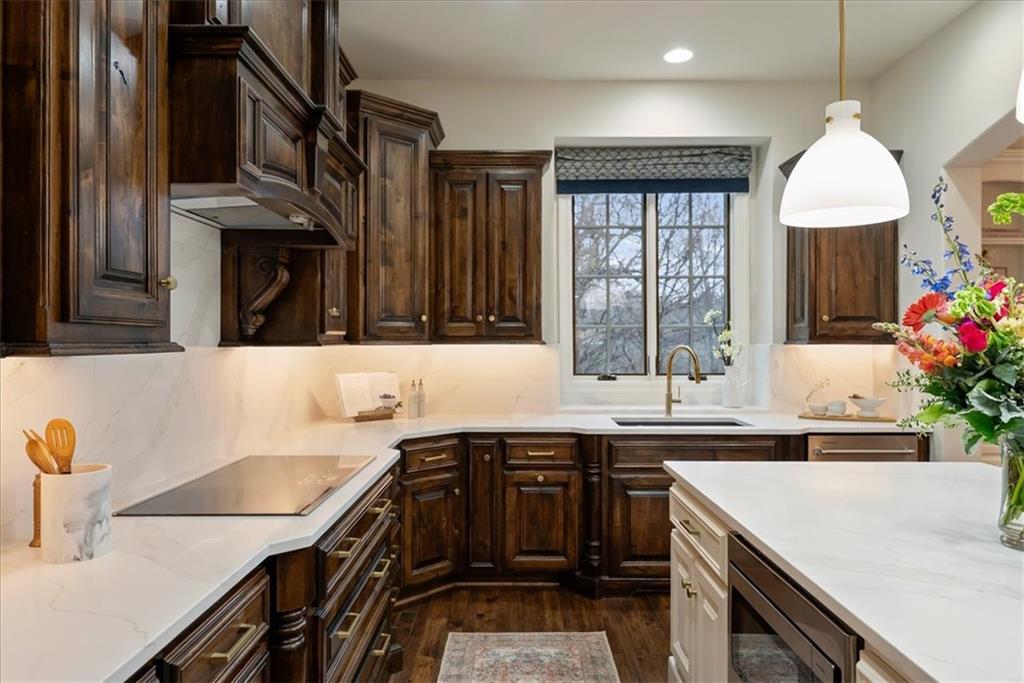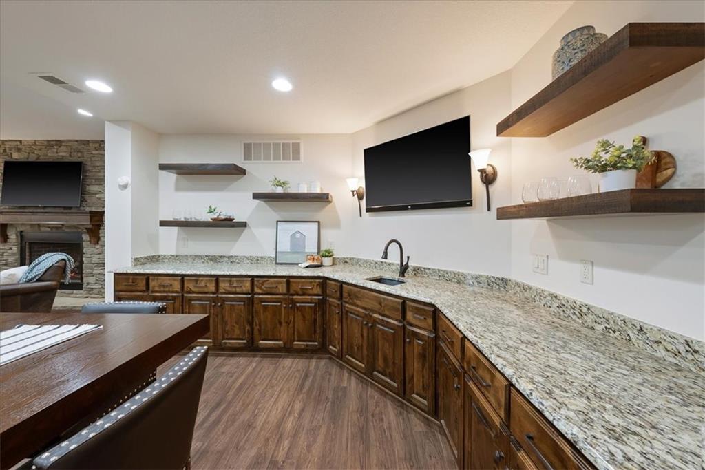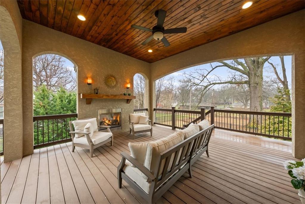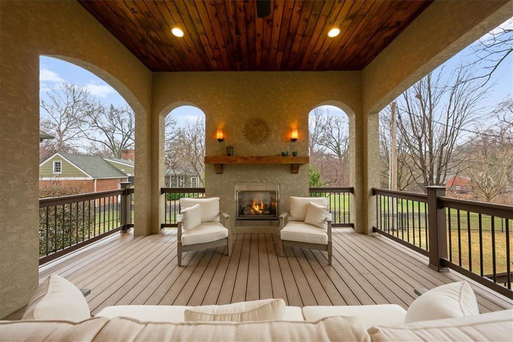Location, Quality & Luxury blend seamlessly in coveted Old Leawood, this exceptional nearly new home combines timeless design w/carefully curated upgrades. Striking stone & stucco exterior & welcoming front entry. Thoughtfully designed space exudes warmth, comfort & sophistication. The GRAND great room—boasts soaring ceilings, exposed wood beams & rich wood flooring—a stunning & inviting space to gather, relax or entertain. The quality of construction & upgraded finishes remain consistent from the 1st level throughout the home! The 1st floor primary suite w/double vanity, large shower w/2 showerheads & Large walk-in closet w/laundry room—an ideal design choice!! Striking Kitchen balances warmth & modern style. Brand-new quartz countertops & backsplash, new gold faucets & accents & w/induction cooktop add a fresh experience! Well designed “flex” storage room w/second refrigerator & work space give options for hidden prep, catering, or a discreet home office. Walk-in pantry, half bath & 2 well-planned mud areas (including a walk-in mud closet tucked behind a pocket door). BONUS large Den, TV Room or could be 2nd main level Guest Bedroom tucked behind kitchen. 3 Bedrooms up—w/walk-in closets w/3 full baths, shared laundry room & a cozy loft ideal for reading, studying, or gaming. The daylight LL mirrors the quality & character of the main floor, featuring 10-foot ceilings, wide open staircase, & an expansive family room w/beautiful stone fireplace, built-ins & wet bar. 2 more bedrooms (or office spaces), full bath, & dedicated workout room w/cushioned flooring & climbing wall & ample unfinished storage. Outdoor living is equally impressive. Covered porch w/Fireplace invites year-round enjoyment, w/outdoor gas firepit, iron-fenced backyard, In-ground Irrigation & distant neighbor views create a private, peaceful setting. This is a home where lifestyle, craftsmanship & location align—carefully designed, beautifully maintained & WELL worth the visit.