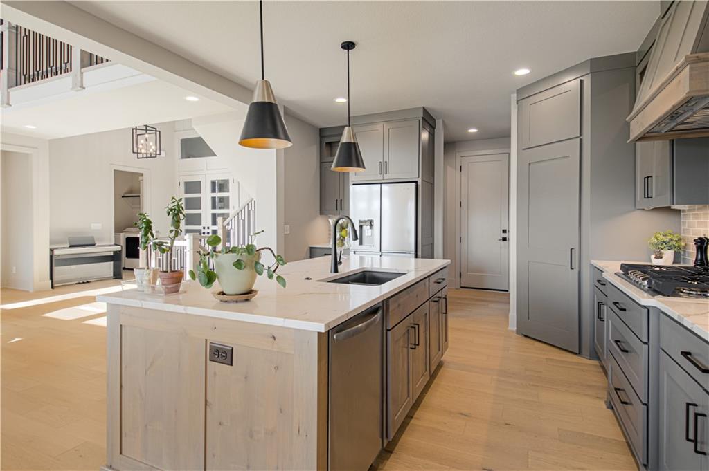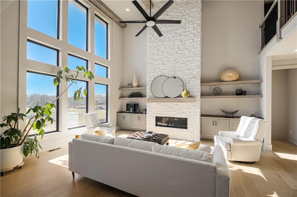 Stunning Light Filled Home with Soaring Ceilings-Barely Lived In and Better Than New! Gorgeous Great Room with Wall of WIndows and 18 ft ceilings, Floor to Ceiling Stone Fireplace and Built Ins! Open Concept floor plan! Gorgeous Hardwood Floors Throughout. Chef's Kitchen includes Oversized Island, Gas Cooking with Hood, SS Convection Oven, Refrigerator, Dishwasher and Microwave. Large 7x4 ft Walk in Pantry. Boot Bench off Garage. Charming Powder room with Decorative Tile feature wall. Spacious Dining Room.10 ft Slider opens to Covered Deck with Stone Fireplace and Maintenance Free Composite Floor. Luxurious Primary Bedroom includes feature wall and Hardwood floors. Luxurious Primary Bath includes Zero Entry Shower, Soaker Tub, Double Vanities with Solid Surface Countertops. 10x8 Walk in closet with amazing built ins including drawer storage and full length mirror. Primary Closet connects to Laundry room - Washer and Dryer stay! Upper level includes Three spacious bedrooms, a jack and jill bathroom and full bath attached to bedroom 4! Amazing upgrades throughout including additional feature walls, dramatic staircase, upgraded black trim windows! Estate lot backs to greenspace. Woodland Trails is a fabulous outdoor lifestyle community with miles and miles of paved walking trails, resort style pool, playground, sports field and fishing pond with fishing dock.