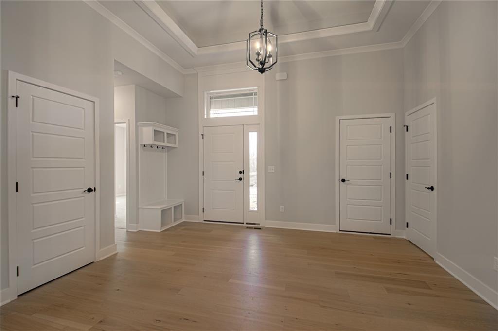 Welcome to the Richmond, a beautifully crafted ranch floorplan by Hoffmann Custom Homes, situated in the highly sought-after Platte County School District. Designed with both style and function in mind, this thoughtfully planned floor plan offers true main-level living with a private primary suite featuring an ensuite bath, along with two additional generously sized bedrooms and a full bathroom. The entryway opens to a spacious great room with soaring ceilings, creating an inviting and open atmosphere. The open-concept kitchen is a standout, showcasing creamy white enameled cabinetry, fresh modern lighting, under-cabinet lighting, a walk-in pantry, and a large island topped with light quartz—perfect for everyday living and entertaining alike. Just off the dining area, a covered deck provides convenient access to outdoor living. Additional main-level features include beautiful engineers hardwoods, a laundry room, coat closet, and a functional drop zone, offering ample storage and organization. Built with 2x6 exterior wall construction, this home is engineered for durability and enhanced energy efficiency. It comes pre-wired for future solar panels, includes an EV charger receptacle, and features additional energy-efficient upgrades throughout. A 10-year structural warranty adds peace of mind. The lower level is stubbed for a future bathroom, allowing flexibility for future expansion or customization. This home seamlessly blends quality craftsmanship, modern finishes, and forward-thinking efficiency in an exceptional location.