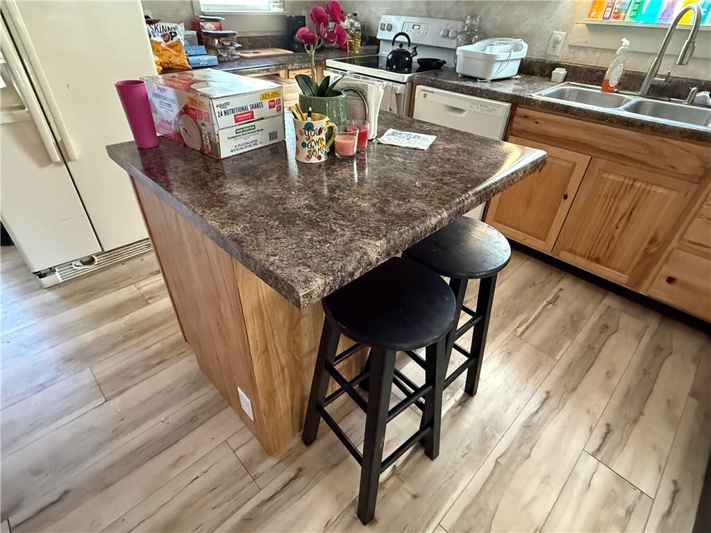 Cute bungalow! It's a 1 1/2 story home with two bedrooms and bath upstairs. Two bedrooms on main floor. Big living room and dining area and a nice kitchen with newer cabinets. Kitchen island and a lot of cabinets. Big laundry room for extra storage.