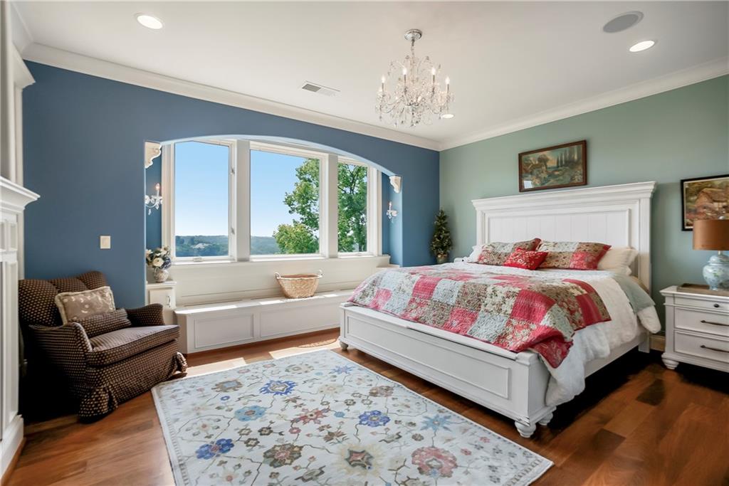 Incomparable custom home designed by Scott Bickford & meticulously built by Charles Kraft. Spectacular views of Shadow Lake & long vista's overlooking the Cedar Creek valley! Recent updates include a completely modernized theater room, new light fixtures & electronics. This phenomenal 5 level property features extensive Brazilian cherry hardwood floors & extensive heated floors as well! Main floor includes a stunning 2-sty Great rm. w/FP, formal dining, Den w/FP, spacious guest suite & casual dining. Dream kitchen features 3 Gaggenau ovens, separate wood front Bosch fridge & freezer, huge walk-in pantry & mud room, twin GE Profile DW's & a 6-burner gas Dacor range! 2nd floor features a spectacular primary suite w/marble bath & FP, custom walk-in shower, expansive walk-in closet, exercise rm., sitting rm., w/adjoining covered deck. Built-ins include a dry-cleaning unit, mini fridge, DW, microwave & make-up vanity w/sink! Three spacious bedrooms all w/private baths & walk-in closets share a versatile loft space. The 3rd floor boasts a large recreation/game rm. & home office, both enjoy the most dramatic views! The finished walkout LL begins with a large Family rm w/stone FP, walk-behind wet bar w/triple Sub Zero fridge/freezer/wine cooler, Meile beverage center, Game rm, 2 additional guest bdrms., full bath, walk-in safe rm & a 22 x 19 tiered Home Theater retreat! Basement level 30' x 25' indoor basketball court w/20 ft. ceilings & climbing wall, which could also be utilized as a golf simulator space, 1/2 pickleball or volleyball court! Over 1,000 sq ft of outdoor paver brick & stained concrete patio space, covered outdoor kitchen & deck w/FP, & plenty of backyard space w/infrastructure in-place to add a swimming pool. Tile roof, circle driveway, exterior constructed with a mix of 100-year-old Coffeyville brick & native limestone. Note: Potential option to enroll children in the Olathe School District if preferred & also close proximity to St. James high school.