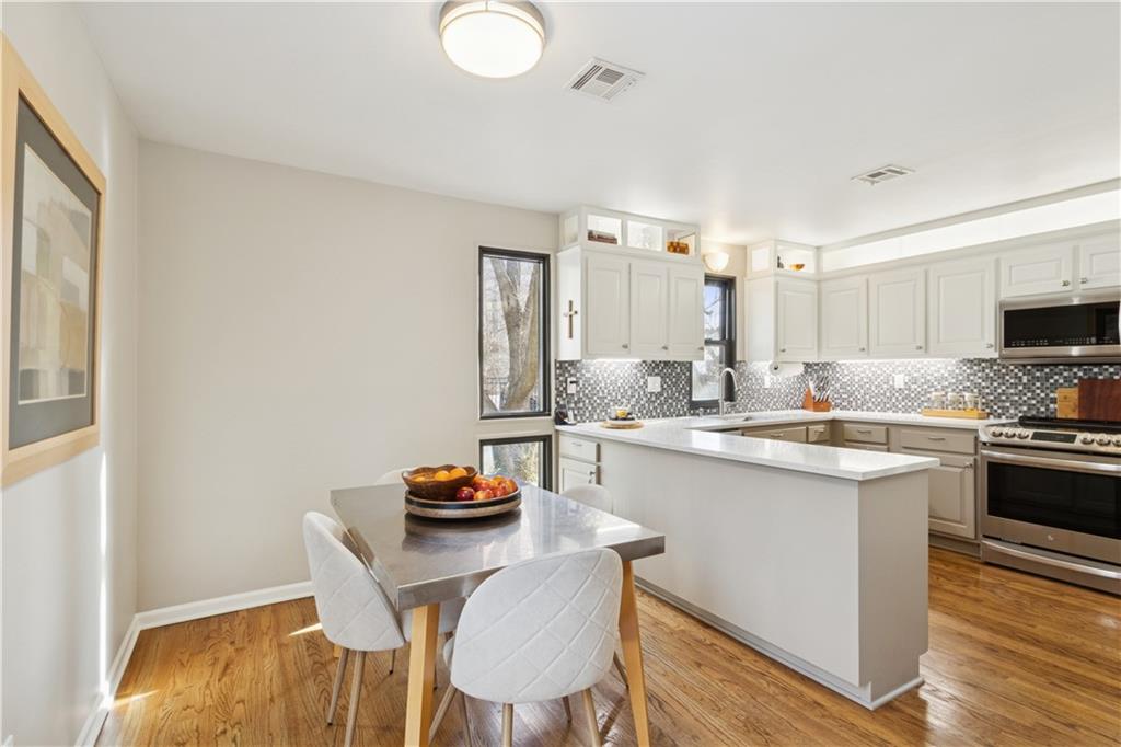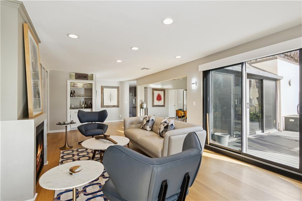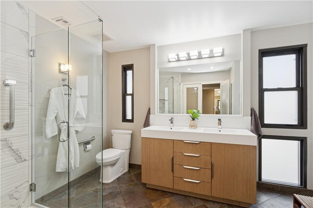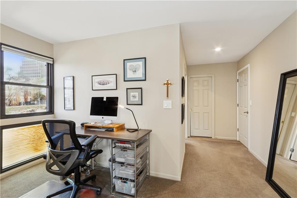 Arguably the best unit in the development as the only one with a straight walk with no stairs from parking to unit & one of only two with its own private entrance! This private, gated community is conveniently nestled between the Country Club Plaza, Kemper Museum, Nelson Atkins Museum and is only a block away from the new Main St streetcar extension! Only 19 units in this contemporary development designed by Moshe Safdie (Crystal Bridges, Kauffman Center) with inground swimming pool and extensive landscaping. This gorgeous unit has a classically contemporary, open floor plan with a ton of thoughtful updates and timeless details throughout. Both the spacious dining room and living room with gas fireplace and wall of bookshelves provide access to the extra large, newly redone Trex deck. You'll love the ample outdoor living/entertaining space that gives you a view of both the pool and the Country Club Plaza! Relax in the primary suite offering both bedroom and office/reading space and loads of closet space! The spa-like primary bathroom has been recently remodeled with a Japanese soaker tub, heated floors, double vanity and walk in shower. The bright secondary bedroom has a walk-in closet, bonus double closet and recently remodeled full bath. And the kitchen- wow! New backsplash and counters, coffee bar, 2 pull out pantries and convenient eat-in space! This spacious unit also gives you a versatile bonus space with sliding doors that open to the dining area and another access point to the deck- use as den, additional office space or 3rd bedroom! So much new in the last 5 years- flooring, all bathrooms, HVAC (1 yr) H2O heater (2yrs) shades, kitchen appliances and more! You'll also find convenient storage space throughout the unit- from the extra space in the utility room to the walk in closet/pantry in the dining room, coat closet in entry, bar closet in living room and linen closet by bathrooms. Extra storage space and 2 covered parking spaces included!