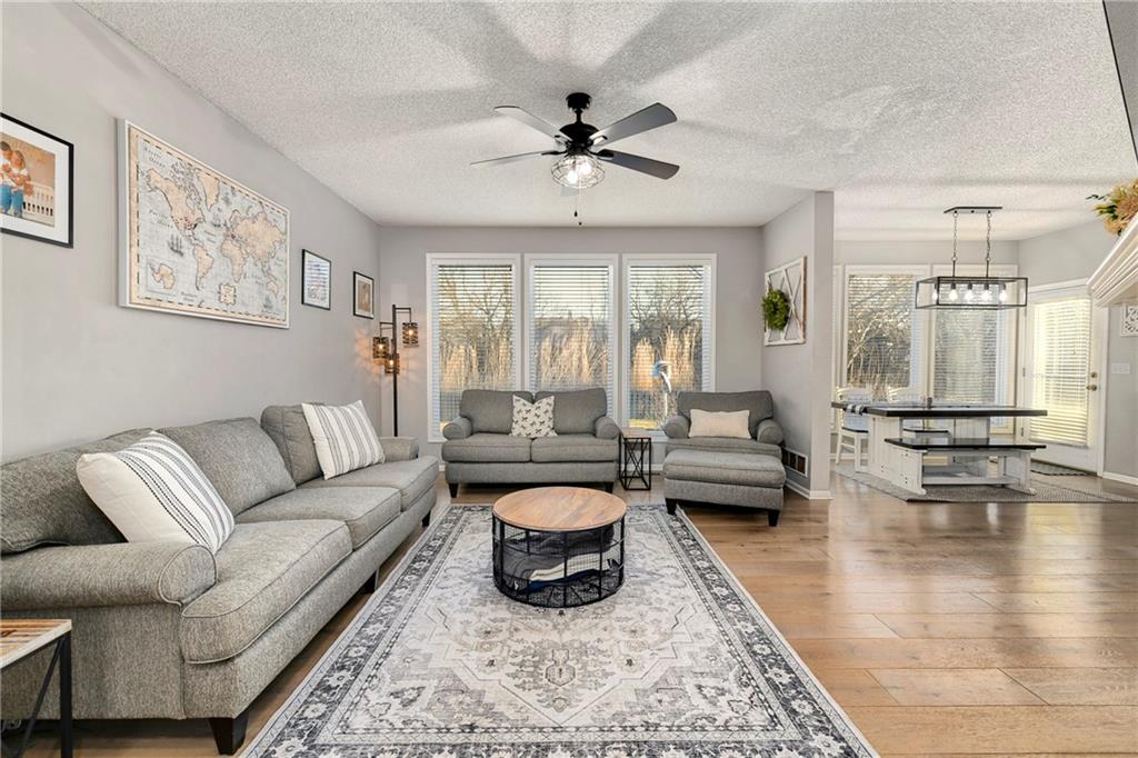 Knockout 2-story in a fantastic location! This gorgeous, move-in-ready home features wide-plank hardwood floors throughout the main level and a dynamic, open floor plan centered around a two-sided fireplace enjoyed from both the great room and kitchen. The bright kitchen offers white cabinetry, granite countertops, updated stainless steel appliances, and opens to a stylish breakfast room—perfect for everyday living and entertaining. Upstairs, the primary suite is a true retreat with LVP flooring, a dramatic vaulted ceiling, a spacious walk-in closet, and a private bath complete with transom window, oversized shower with seat, double vanity, and heated tile floors. Secondary bedrooms are generously sized with excellent closet space and share a Hollywood bath with double vanity. Recent updates include flooring throughout, updated light fixtures and interior paint, an updated fireplace façade, fresh exterior paint and new garage doors in 2025. A radon mitigation system adds peace of mind. The private, fenced backyard backs to greenspace and the Indian Creek Trail—an ideal setting to relax or entertain on the composite deck with built-in seating. An in-ground sprinkler system helps keep the yard looking its best. Enjoy neighborhood amenities including a pool, trails, playground, and regularly planned community social events like parade & egg hunt. Plus the elementary school is just a few blocks away. This home truly offers the total package at an exceptional value. Schedule your showing today!