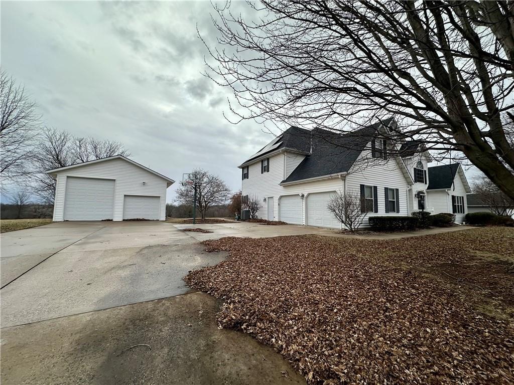 Set on 1.52 acres with sweeping country views, this exceptional 4-bedroom, 3½-bath home offers the perfect blend of elegance, comfort, and modern efficiency. The thoughtfully designed main level features a formal dining room, a cozy breakfast room, and a spacious great room with a fireplace, creating ideal spaces for both everyday living and entertaining. The main-floor owners’ suite provides a private retreat, while the main-floor utility room adds everyday convenience. The kitchen is beautifully appointed with granite countertops, ample cabinetry, and a walk-in pantry, making it as functional as it is inviting. A striking staircase with a balcony overlook leads to the upper level, adding architectural charm and an open, airy feel. The unfinished basement, already stubbed for an additional bathroom, offers excellent potential for future living space. Outdoor and utility features truly set this property apart, including a maintenance-free deck, new roof, solar panels with a backup solar generator, and incredible outdoor storage with a 2-car attached garage plus a large 2-car detached garage complete with a workbench. Enjoy peaceful mornings and breathtaking sunsets with unobstructed views of the surrounding countryside—this is living at its finest, with the space, upgrades, and flexibility you’ve been searching for.