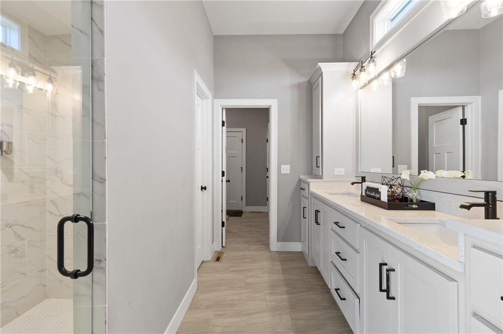 This BEAUTIFUL 5 bedroom, 3 bath home, built in 2022, combines modern design with comfortable living! The main level features 10 foot ceilings, designer finishes, and an open great room that flows into a chef’s kitchen with built-in appliances and generous storage. Primary suite offers a spa-inspired bath with an OVERSIZED ZERO ENTRY shower. The finished basement adds valuable living space with a rec room, wet bar, two bedrooms and one full bathroom. Enjoy the covered porch and spacious yard, as well as access to Pryor Ridge community amenities including trails, playground, courts, dog park, and pool!!