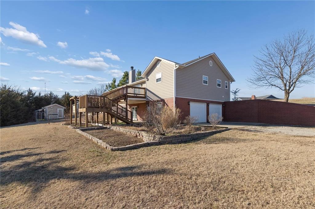 Set on 3.9 acres, this stunning hillside ranch offers 4 bedrooms, 3 baths, and 2,364 sq ft of living space with breathtaking panoramic views of Caney. The main floor features ¾ rough-hewn oak floors, an open layout with wood-burning fireplace, primary suite with private bath, and French doors leading to a spacious deck. The walkout basement includes a second living area with fireplace, garage access, guest bedroom, and full bath. Recent updates include a new roof (2024), HVAC (4 yrs), and 60-gal water heater (3 yrs). Outdoor highlights include a stocked pond, enclosed chicken coop, 15 irrigated raised garden beds, a small vineyard, fruit trees, and perennial landscaping. Extras like a storage shed, weather station, security camera, and LED lighting make this Caney Heights gem move-in ready. Schedule your showing today!