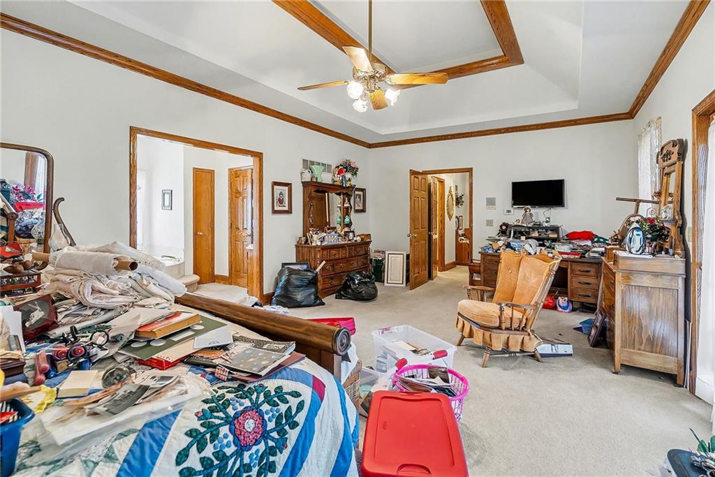 Situated on 10± acres in the Smithville School District, this expansive 1.5-story estate offers 3,900+/- square feet of living space, timeless character, and endless potential. The property features a unique barn highlighted by burned wood joists reclaimed from the historic 1917 Kansas City Stockyard Fires, adding a rare touch of history and charm. A grand double-door entry opens to a stunning two-story foyer with a curved staircase leading to the upper level. The formal dining room off the entry is generously sized, perfect for hosting large gatherings. The kitchen offers abundant cabinet space, a walk-in pantry conveniently located near the laundry room, an eat-in breakfast nook with peaceful backyard views, and a wood-burning fireplace. Multiple living areas provide flexibility, including an informal family room with fireplace for relaxed evenings and a formal living room ideal for entertaining. A main-level study with its own fireplace creates a comfortable work-from-home space. The spacious primary suite is also located on the main level and features a walk-in closet and private ensuite with dual vanities, whirlpool tub, and separate shower. The laundry room sits just off the garage and kitchen, and two half baths complete the main floor. Upstairs, a balcony overlooks the foyer and leads to two oversized secondary bedrooms, each measuring approximately 12x27, offering multiple closets and sharing a Hollywood-style bathroom. The unfinished lower level provides a blank canvas for future expansion and is ideal for a family room with a wood-burning stove as the focal point. Outdoors, enjoy the in-ground heated pool with diving board and slide, spend time in the barn, or explore the privacy and natural beauty of the 10± acres. This property offers solid bones, generous space, and a prime setting, with cosmetic updates needed to bring it to today’s market and make it your own.