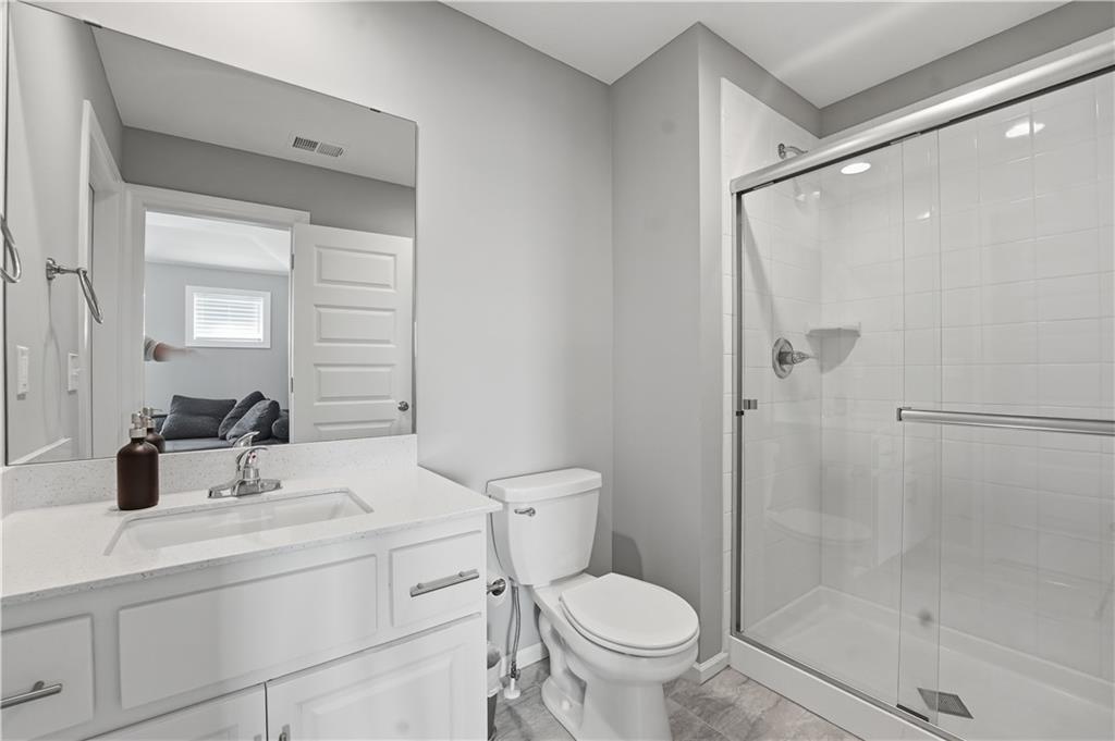 The popular James Engle Emory plan is quality built with 2x6 frame. This home offers a beautiful front elevation and a functional layout. Set on a cul-de-sac, this nearly new home sits high on a hill facing south, with a landscaped island and a fenced yard backing to green space. Double doors open to a light and bright interior featuring a main-floor primary suite plus an additional bedroom with a full bath-perfect for guests or a home office. The kitchen includes a spacious island, tall cabinetry, and a contemporary design ideal for everyday living and entertaining. Upstairs offers two bedrooms with private, ensuite baths and a loft. Relax outdoors on the screened porch overlooking green space. The garage is prepped for EV charging. This neighborhood truly has it all to create new friendships with extensive amenities including a club house, pickle ball courts, trails, pool and play area.