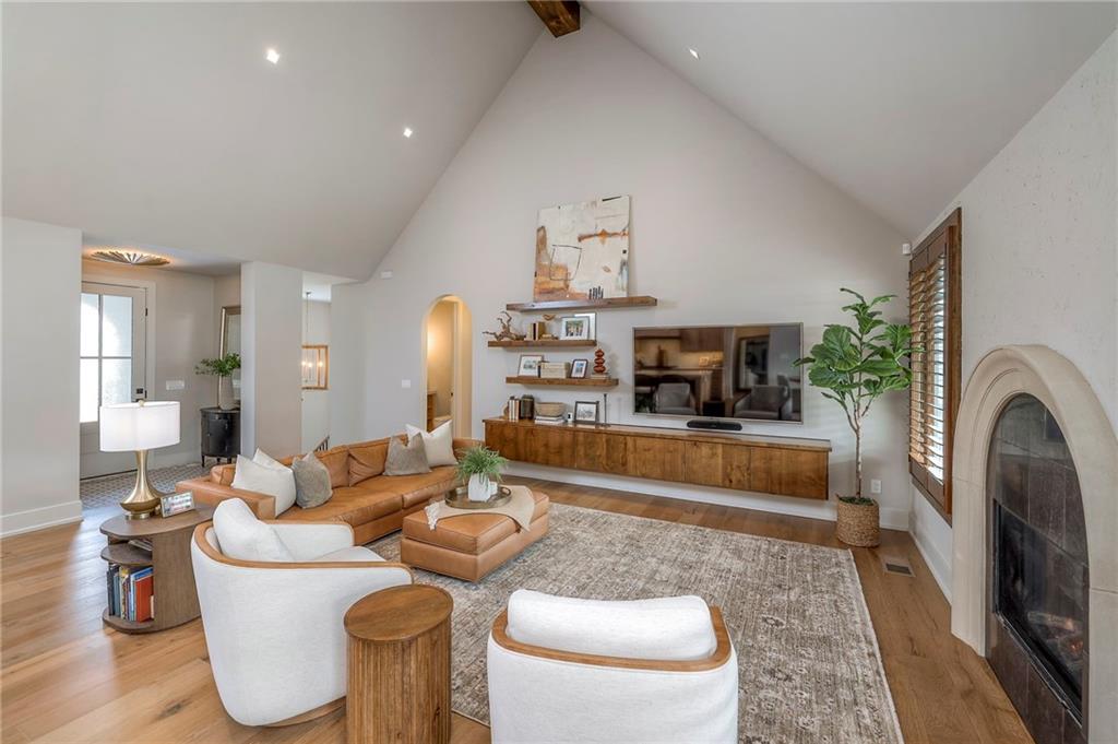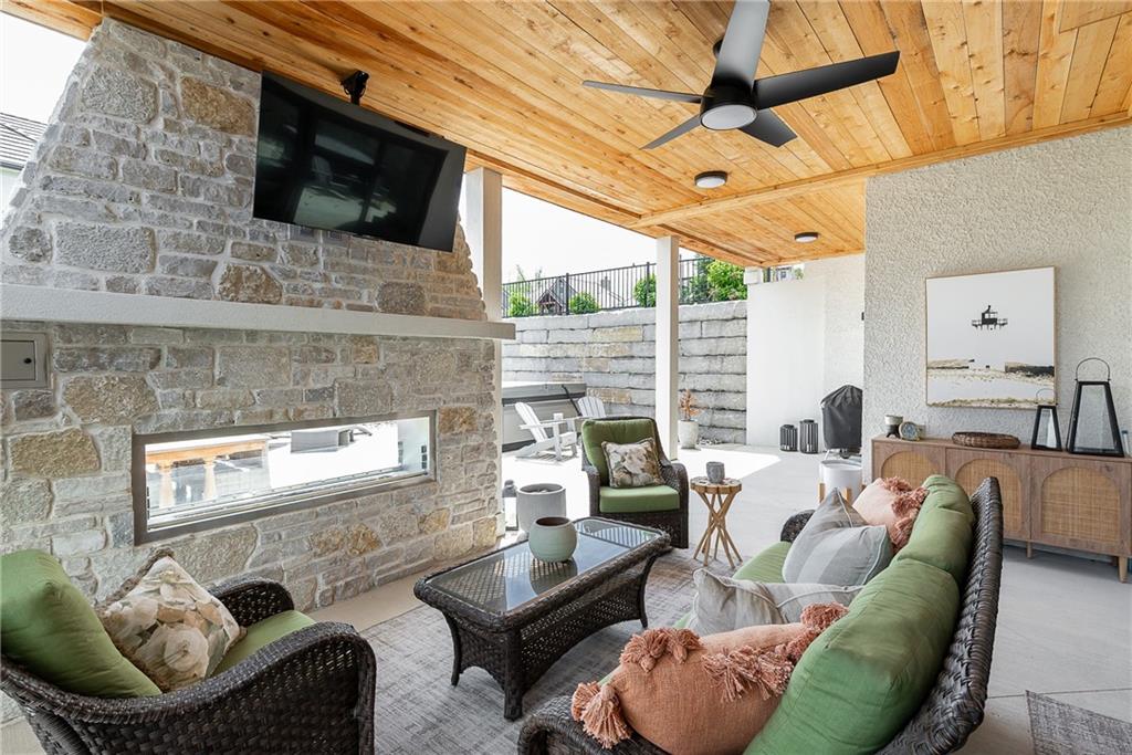 Welcome to this stunning, thoughtfully designed home where elevated finishes and exceptional entertaining spaces come together beautifully. The dramatic living room showcases soaring 18-foot ceilings, custom built-ins, and charming arched fireplace, all complemented by wide-plank hardwood flooring that flows seamlessly throughout the main living areas. Plantation shutters throughout the home and elegant arched doorways add timeless architectural character, style, and privacy. The designer kitchen is both sophisticated and functional, featuring a gas range, quartzite countertops, striking stone feature wall, wine fridge, and abundant workspace for everyday living or hosting. Just off the kitchen, a spacious butler’s pantry provides additional storage and convenience, complete with a second oven, making entertaining effortless. The kitchen opens directly to a large covered deck with low-maintenance Trex decking, creating the perfect indoor-outdoor connection. The luxurious primary suite is a private retreat, highlighted by a beamed ceiling and stone feature wall, and complemented by a spa-inspired bath offering LED mirrors, quartzite countertops, a soaking tub, and an oversized walk-in shower. The laundry room is conveniently located just off the primary suite for added everyday ease. The walk-out lower level is designed for unforgettable gatherings, featuring a media room and an impressive entertaining bar with waterfall-edge quartzite countertops, microwave, drink fridge, and wine fridge. Step outside to the patio, partially covered for year-round enjoyment, complete with a see-through stone fireplace and hot tub, creating an inviting outdoor living space perfect for relaxing or hosting guests.