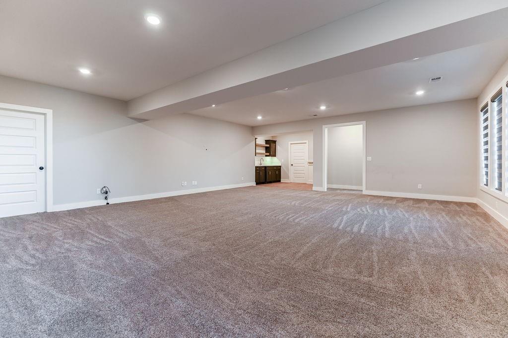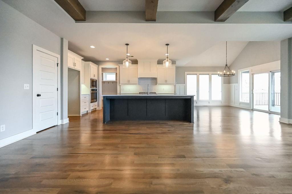 Enjoy main-level living in this stunning Reverse 1.5 Story, ideally located on a quiet cul-de-sac just steps from Lake Lenexa and the soon-to-be-completed neighborhood amenity center. Backing to treed greenspace, this home offers privacy, scenic views, and easy access to trails and community amenities. The open kitchen and dining area are designed for both everyday living and entertaining, featuring custom cabinetry, a large island, walk-in pantry, and direct access to the covered deck—perfect for grilling, relaxing, or outdoor dining. The main-level primary suite includes a spacious bedroom, spa-inspired bath, oversized walk-in closet, and conveniently connected laundry. A second main-floor bedroom and full bath provide flexibility for guests or a home office. The walkout lower level expands your living space with an oversized recreation room, large windows overlooking the trees, and a finished wet bar ideal for hosting or movie nights. Two additional bedrooms each have private baths, offering comfort and privacy. Notable features include a reinforced concrete storm shelter, dedicated electrical for a patio hot tub, and EV-ready wiring in the garage. Located in desirable West Lenexa with HOA amenities including pool, trails, play area, and more. All offers will be considered. A rare blend of location, design, and functionality—this home is a must-see.