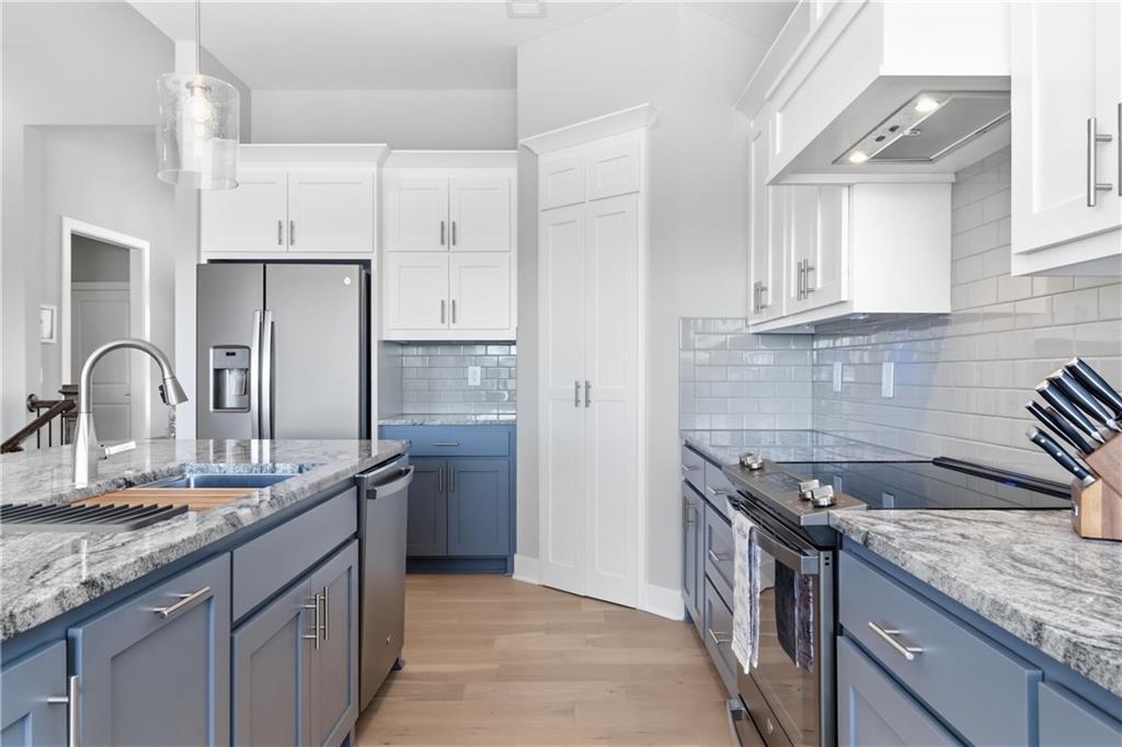 Enjoy the most gorgeous Kansas sunsets from your back deck at this beautiful and like new reverse ranch "Wheeler" plan, with so much natural light and space for everyone. Built just 3 years ago, this home welcomes you in, with a main floor office/guest suite, mudroom and laundry room, and oversized 3 car garage. Primary suite overlooks green space, complete with a massive ensuite providing a soaker tub, walk-in shower, and wonderful storage. Kitchen built to host, with spacious pantry, beautiful island, and dining space. The basement has barely been used - providing 2 bedrooms each with walk-in closets, a living space, and room for games. Upgrades throughout - and pride of ownership shows. Home sits across the street from award winning elementary school, and neighborhood provides such amenities like fitness center, sport courts, splash pad, park and pool! Totally turnkey with all the upgrades.