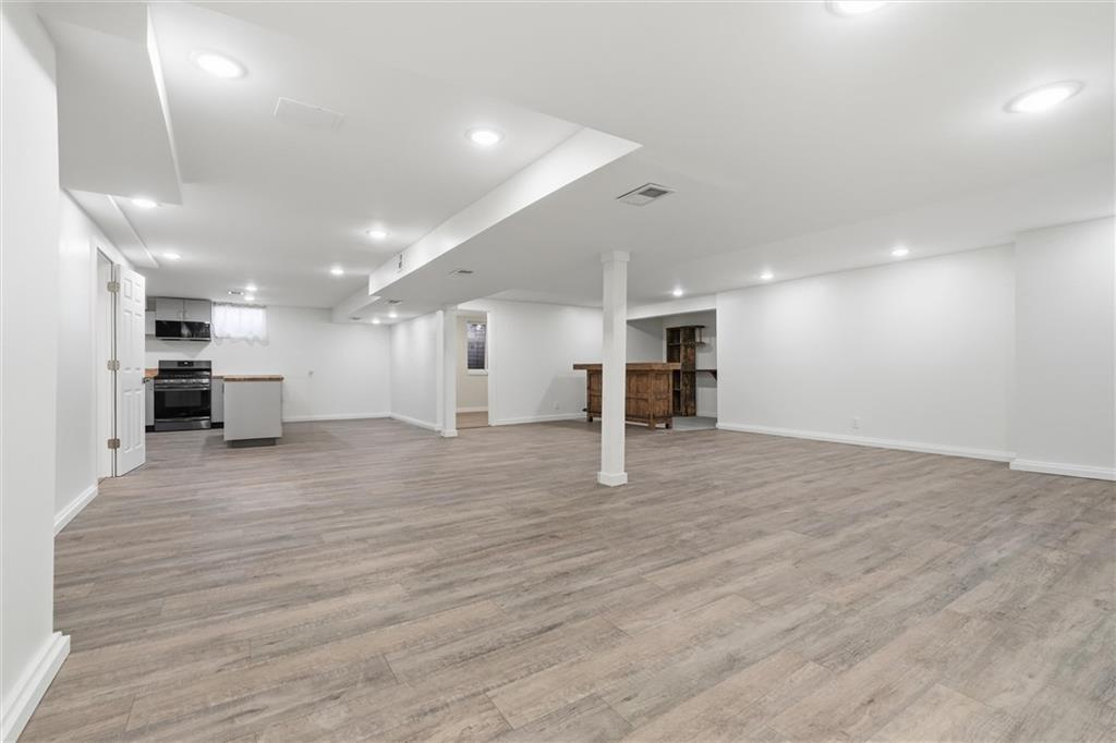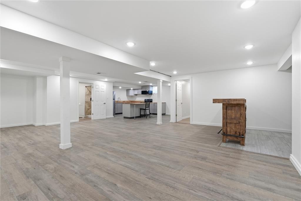 Discover this stunning custom home in the highly sought-after Village of Oakwood, where modern elegance blends seamlessly with timeless charm. This residence has been transformed into a sophisticated, move-in-ready retreat. Tucked at the end of a quiet no-thru street, the home offers exceptional privacy and tranquility. A bold exterior and impressive entry door entry make a striking first impression. Inside, engineered hardwood flooring, fresh white paint, recessed lighting, and updated fixtures create a bright, contemporary atmosphere throughout. The contemporary kitchen is both stylish and functional, featuring ample workspace and storage—plus all appliances stay. A conveniently located walk-in pantry and main-level half bath add everyday practicality. Enjoy the comfort of a main-floor primary suite, complete with a custom vanity, stunning spa-like tiled shower and expansive closet system. A second bedroom on the main level includes its own walk-in closet, and the laundry room offers additional storage with a custom wall cabinet. The updated hallway bathroom maintains the home’s clean, modern aesthetic. Large living room space with views of the backyard plus formal dining space and secondary living room/office space complete the main floor. Upstairs, two additional spacious bedrooms each feature mini-split units for personalized climate control, ensuring year-round comfort. Finished basement adds a great communal space for media area, brand new modern kitchen with center island, separate bar space plus two more bedrooms and full bathroom! Step outside to a beautifully fenced backyard featuring a charming upper stone patio, perfect for entertaining, along with a covered lower patio that offers shade and relaxation on warm summer days. Located within walking distance to Oakwood Manor Elementary and just minutes from local amenities and highway access, this thoughtfully renovated home delivers style, comfort, and convenience in one exceptional package.