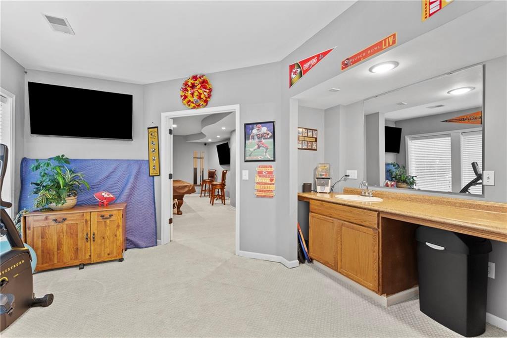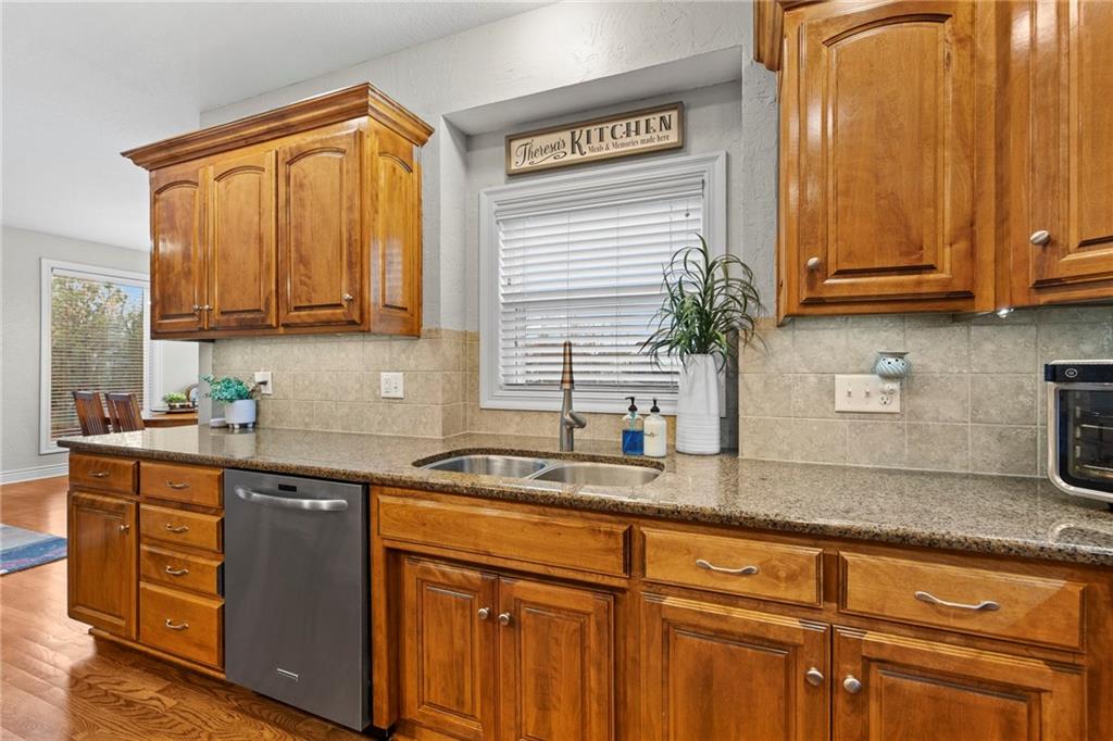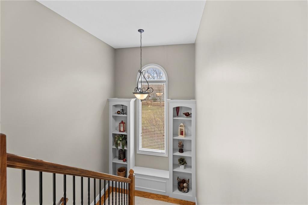 Situated on an almost half-acre fenced cul-de-sac lot, this beautifully maintained home offers space, style, and thoughtful updates throughout. Recent improvements include newer interior and exterior paint, updated hardwood floors, newer carpet, and designer stair carpet that adds a custom touch. The kitchen is both functional and inviting with granite countertops and abundant cabinetry. The main floor office offers built-ins for an ideal work-from-home setup. Upstairs, the spacious primary suite features a tray ceiling with lighting and fan, along with a luxurious bath that includes a double vanity, jetted tub, and an oversized walk-in closet. Secondary bedrooms are generously sized with walk-in closets and includes a Hollywood bath with granite countertops. One bedroom has a private bath and includes a built-in trundle bed and shelving, making it perfect for guests or a versatile flex space. The finished walk-out lower level expands the living space with a large family room, additional bedroom, full bath with jetted tub and shower, plus a workout room or private office. Outdoor living shines with an expanded composite deck featuring iron spindles, plus a stunning oversized hot tub with multicolored lighting that opens directly onto the patio — perfect for relaxing or entertaining. A storage area beneath the deck offers plenty of space for lawn equipment. Additional highlights include: Two newer HVAC systems, dual water heaters, a newer roof, and a 3-car garage with insulated doors and extensive shelving. The neighborhood offers outstanding amenities including a pool, playground, and walking/biking trails, and is located within the award winning Blue Valley School district with convenient highway access.