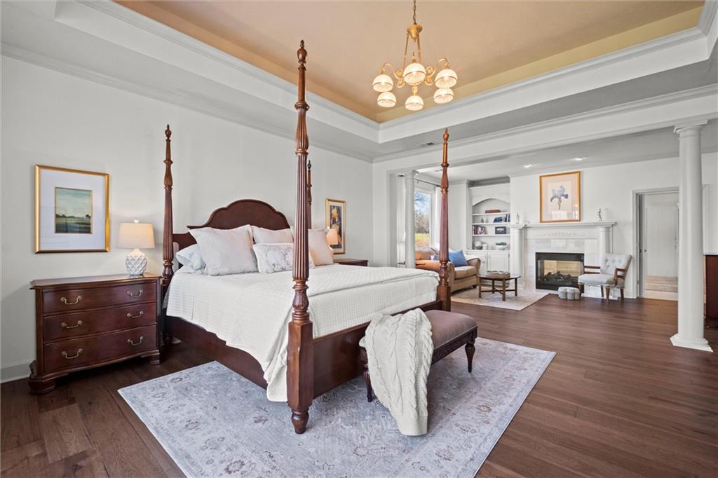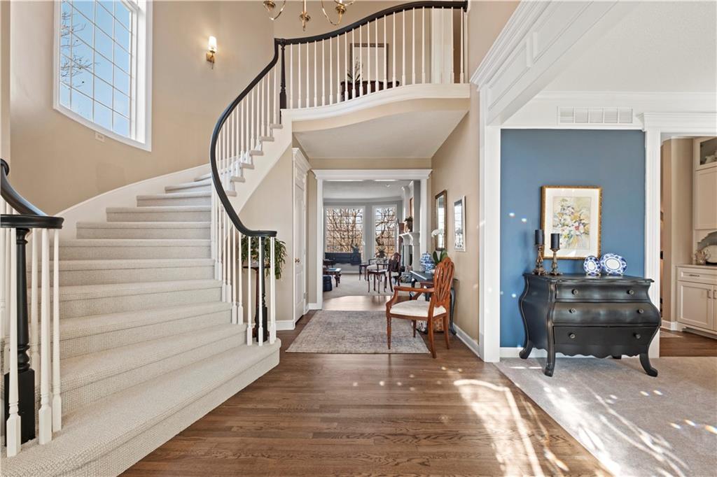 Welcome to this 10 acre estate in prime Overland Park location! Nestled at the end of a long private drive lined with vibrant October Glories, this timeless 4 bedroom, 4.5-bath home has been meticulously maintained and offers the perfect blend of luxury, charm, and privacy all just minutes from 69 highway. Set on 10 breathtaking acres backing up to 31 acres of wooded conservation land, this estate offers serene views, a pond, and endless possibilities for recreation or future development. The heart of the home is the open and bright main level featuring formal dining, formal living room, office, hearth room with see-through fireplace and a beautiful updated kitchen featuring top-of-the-line appliances, double ovens, induction cooktop, oversized island, and a spacious walk-in pantry. Upstairs, newly installed wood floors flow throughout the hallway and into the primary suite offering an expansive sitting area with fireplace, large primary bath and oversized walk in closet. Three additional bedrooms are upstairs, each with their own dedicated bathroom and walk in closet. The finished walk out lower level includes a second kitchen area, media room, home office, and additional living space. Outside, you'll find a beautifully maintained drive through barn that houses a fully updated kitchen complete with granite countertops, custom cabinetry, and a walk-in cooler room ideal for hobbies or catering needs. Store outdoor equipment, machinery, and cars in this expansive barn with separate shop and stairs leading to an upper level for additional storage space. Along with a list of updates, the exterior was freshly painted along with a new hot water heater installed last year. Just minutes from 69 Highway, and within the Blue Valley School District this rare home offers easy access to top-tier shopping, dining, and everyday conveniences. Whether you’re seeking a private family estate or land with development potential, this property offers it all! Open House 3/14, 1:00-3:00pm