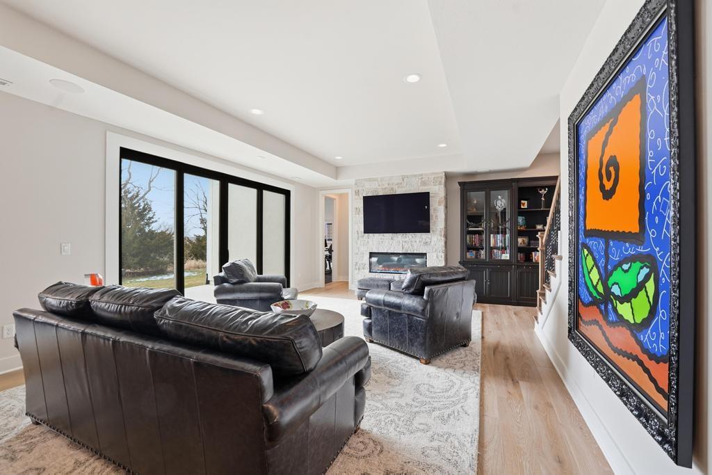 Almost new and lightly lived in, this custom-built home offers elevated design, thoughtful upgrades, and effortless living in the resort-style community of Cedar Creek. Perfectly positioned backing to Hole #5 tee box of the award-winning private Shadow Glen Golf Course, the setting offers both beauty and privacy. Inside, the light-filled, open floor plan showcases modern wide-plank luxury wood flooring, LED lighting throughout, & motorized shades. As you enter the home, your eyes are immediately drawn to the large wall of windows overlooking the golf course in the great room with vaulted ceiling, stunning fireplace and built-ins. The gourmet kitchen features a large quartz island, walk-in pantry, and GE Café appliances with striking copper hardware including a gas range, refrigerator, microwave, beverage fridge, and dishwasher. The laundry room offers a convenient sink and built-ins. Designed for comfort, you can relax on the screened-in porch with fireplace and TV. The spacious primary suite has wood floors and lighted tray ceiling. The spa-inspired bath has a large tiled shower, soaking tub, under-cabinet lighting, and a large walk-in closet with built-ins & dedicated makeup/vanity area. A second main level bedroom also features luxury wood flooring. The stunning lower level, complete with modern fireplace and a full wet bar featuring honed quartz counters, wine fridge, microwave, dishwasher, sink, and ice maker is perfect for gatherings with friends and family. Two additional bedrooms in the lower level with a shared bath are perfect for guests. A huge finished storage closet with custom built-ins provides exceptional organization. Additional upgrades include a recirculating water system, two 50-gallon water heaters, electric vehicle charger hookup, epoxy garage floor, sealed driveway, buried drains, and striking stucco and stone exterior. Maintenance-provided services include lawn care and snow removal. This is refined, low-maintenance luxury living at its best.