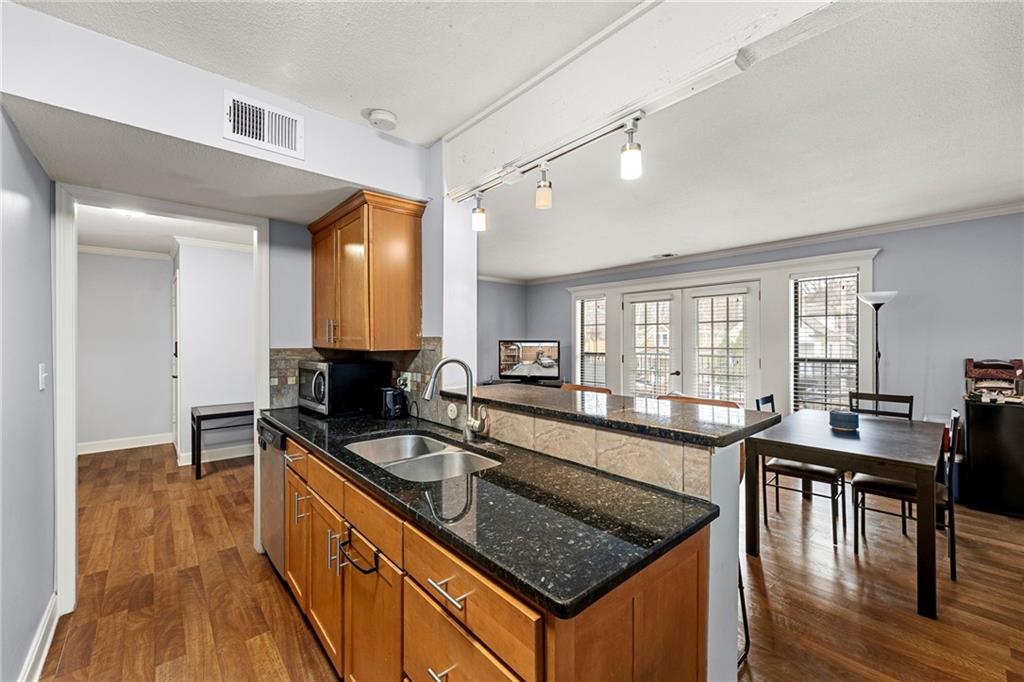 Welcome to Plaza Hills—where location and lifestyle meet in the heart of Kansas City. This light-filled condo offers two spacious bedrooms, two full bathrooms, and one of the largest floor plans in the community. Located in a secure, gated complex just one block from the Country Club Plaza, this upper-level unit features an open-concept layout ideal for everyday living and entertaining. The updated kitchen showcases ceiling-height cabinetry for exceptional storage including a wine rack, granite countertops, stainless steel appliances, and a classic subway tile backsplash. Luxury vinyl plank and hardwood flooring, fresh interior paint, and updated fixtures create a bright, modern feel throughout. All appliances, including the in-unit washer and dryer, stay with the home. French doors open to a private covered deck overlooking the pool—perfect for morning coffee or relaxing evenings. A reserved parking space directly behind the building adds everyday convenience. Residents enjoy premium amenities including a fitness center, secured package delivery, and a beautiful community pool. Ideally positioned between the Country Club Plaza and Westport, and minutes from the Nelson-Atkins Museum of Art, this condo offers unbeatable access to Kansas City’s best dining, shopping, and entertainment.
