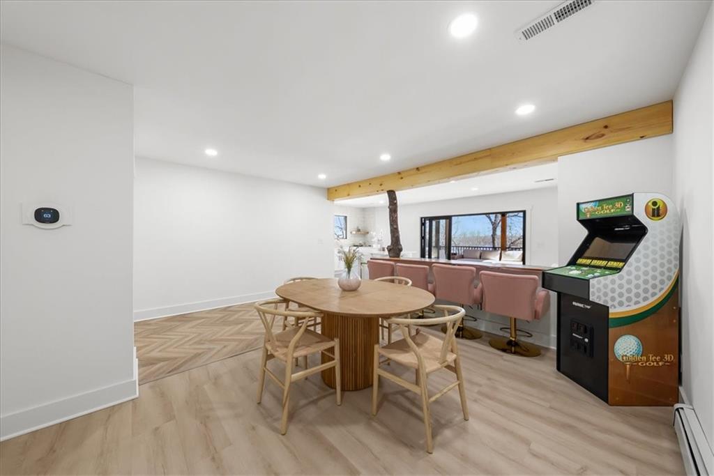 Welcome to your own slice of paradise at the lake! This stunning ranch-style lakefront home at Lake Pomona offers 5 bedrooms and 4 bathrooms, and has been meticulously updated and lovingly maintained. A marble-tiled entry welcomes you into an expansive eat-in kitchen featuring abundant prep space, extensive countertops, and a large center island with seating for four—perfect for gathering with family and friends. Just off the kitchen, a sitting room with louvered folding patio doors opens to a three-season room and onto a renovated deck overlooking the beautifully maintained grounds, complete with a putting green and tranquil pond. The formal dining room is conveniently located just steps away, making entertaining effortless. The main level includes a spacious primary en-suite retreat with a soaking tub, separate shower, and generous vanity. Two additional bedrooms and a full bath with double sinks and a walk-in shower complete the main floor. The finished lower level offers even more living space with a large family room, two additional bedrooms—one currently designed as a bunk room that sleeps eight—plus a full bath and laundry area. Step outside from the lower level to enjoy the fire pit and pathway leading directly to the double dock. Designed for making memories, this exceptional lakefront property is the perfect weekend escape for large families and year-round enjoyment.