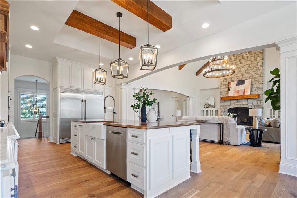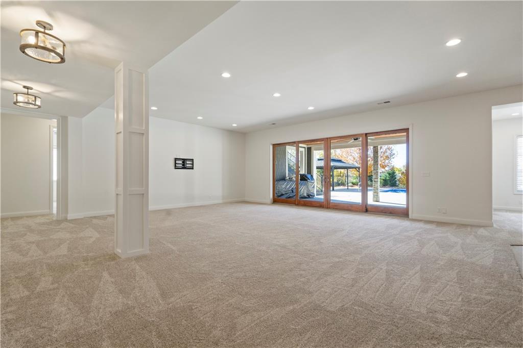 SHOWSTOPPER Reverse 1.5 story in The Farms at Garnet Hill! Impressive from the start--thoughtful landscaping, circle drive and a 5 car garage. Custom build by Cecil & Ray design team. This elegant home blends timeless design with resort-style living. Step inside to soaring ceilings, rich hardwoods and expansive windows showcasing beautiful views of the private backyard oasis. The open-concept main level features a great room with stone floor to ceiling fireplace and built-ins flowing seamlessly into the gourmet kitchen. Please any chef and entertain in style in this expansive kitchen featuring custom cabinetry, large center eat-in island, walk-in butler's pantry and high-end stainless steel appliances. Adjacent dining and breakfast areas! Easily move the experience onto the lanai with multiple access points for convenience. Spacious primary suite offers a spa-inspired bath including double vanity, soaking tub, large walk-in shower and huge walk-in closet conveniently adjacent to laundry room. Second main-floor bedroom or office with built-ins adds flexibility. Option to take the stairs or use the elevator to the beautifully finished walk-out basement. Here the entertainer’s dream continues with a family room, rec area, gorgeous wet bar, tiered media room, two additional bedrooms each with their own en-suite bath and walk-in closets and bonus pool bathroom with changing room and 2nd laundry. Walk-out access to the in-ground resort styled pool, covered patio, sun deck and lush landscaping providing privacy. Impeccably maintained, thoughtfully designed and located in one of Overland Park’s most desirable neighborhoods—this is luxury living at its finest! WELCOME HOME!