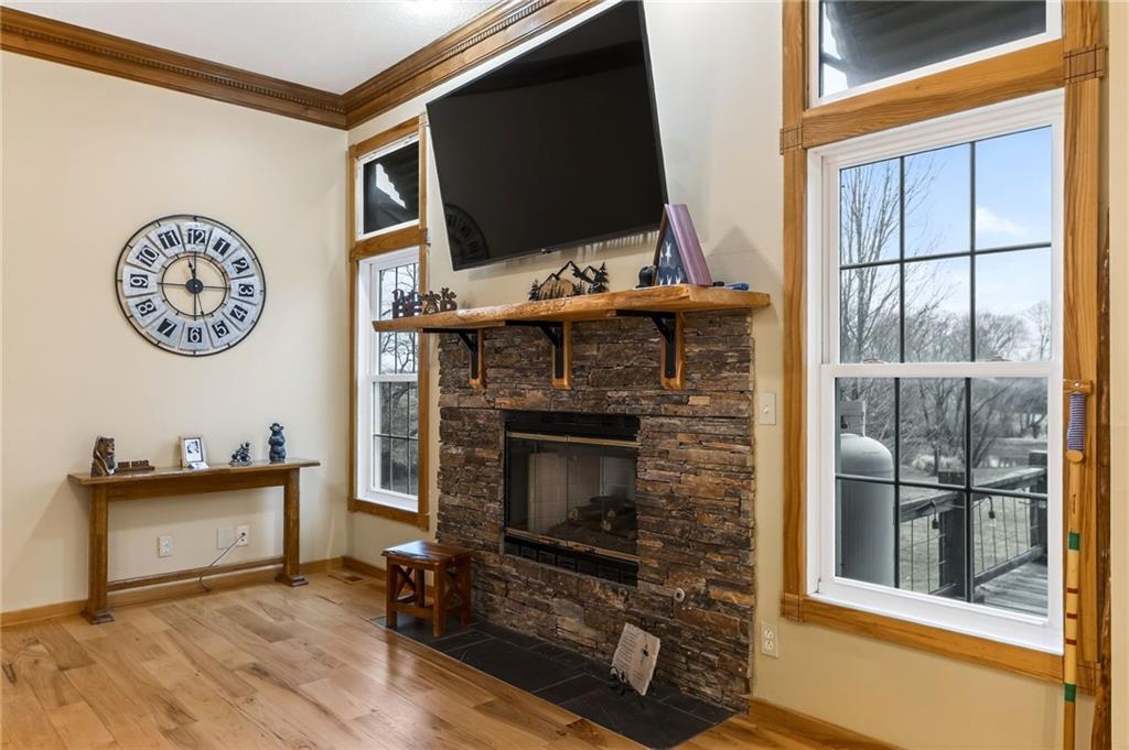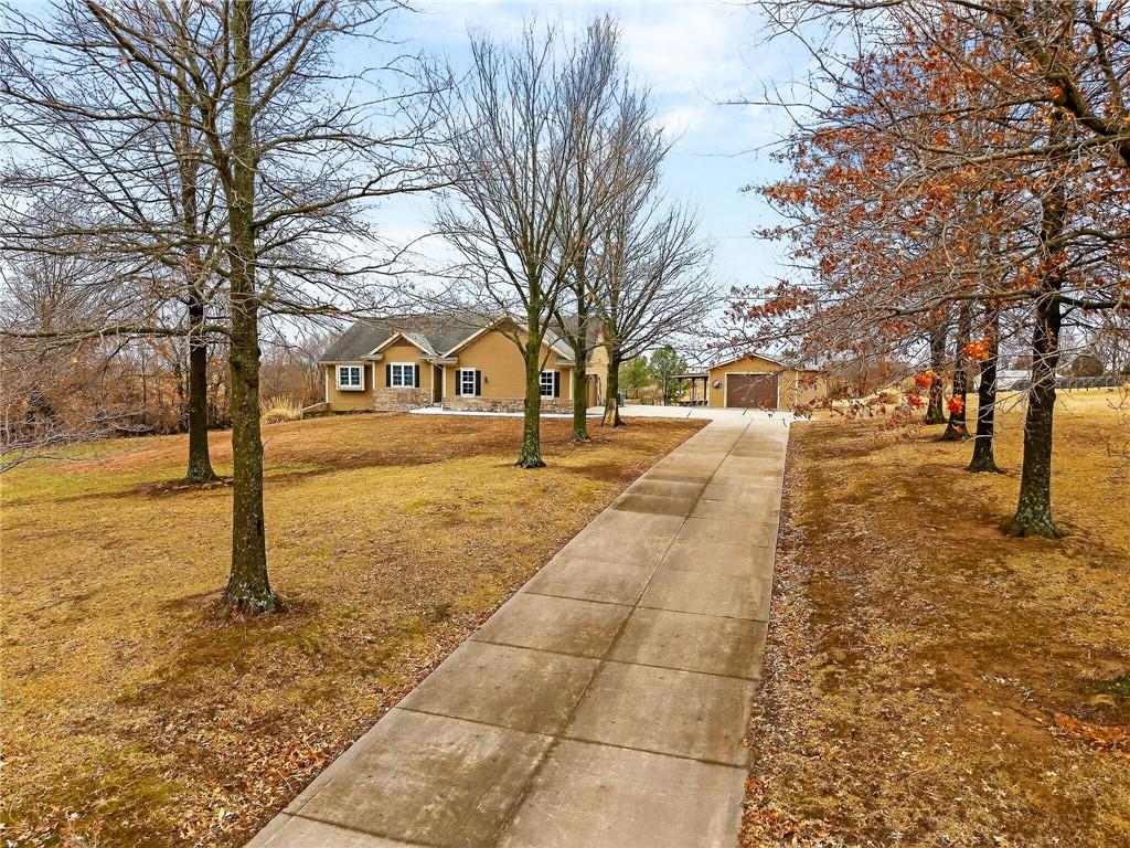 Fabulous Custom Home on Acreage with Pond & 28x20 Outbuilding! Nestled on beautiful acreage with a private pond and mature trees, this stunning custom-built home offers quality craftsmanship and thoughtful design throughout, featuring custom woodwork and exceptional details at every turn. The open-concept family room and kitchen showcase a gorgeous custom island with a rich wood top, newer appliances that stay, and a striking stone wood burning or gas fireplace with custom mantel as the focal point. A spacious laundry room with built-ins provides convenient garage access. As a bonus, the main floor offers 3 spacious bedrooms, a full bath, and a private master suite with a spa-like bath. The fully finished basement adds a large recreation room, kitchenette, and full bath — perfect for guests or multi-generational living. Enjoy outdoor living on the expansive deck and lower patio overlooking the property, plus a detached shop/garage and a fourth garage with backyard access for extra storage or recreational vehicles. A rare blend of privacy, functionality, and custom charm — peaceful country living with modern comforts.