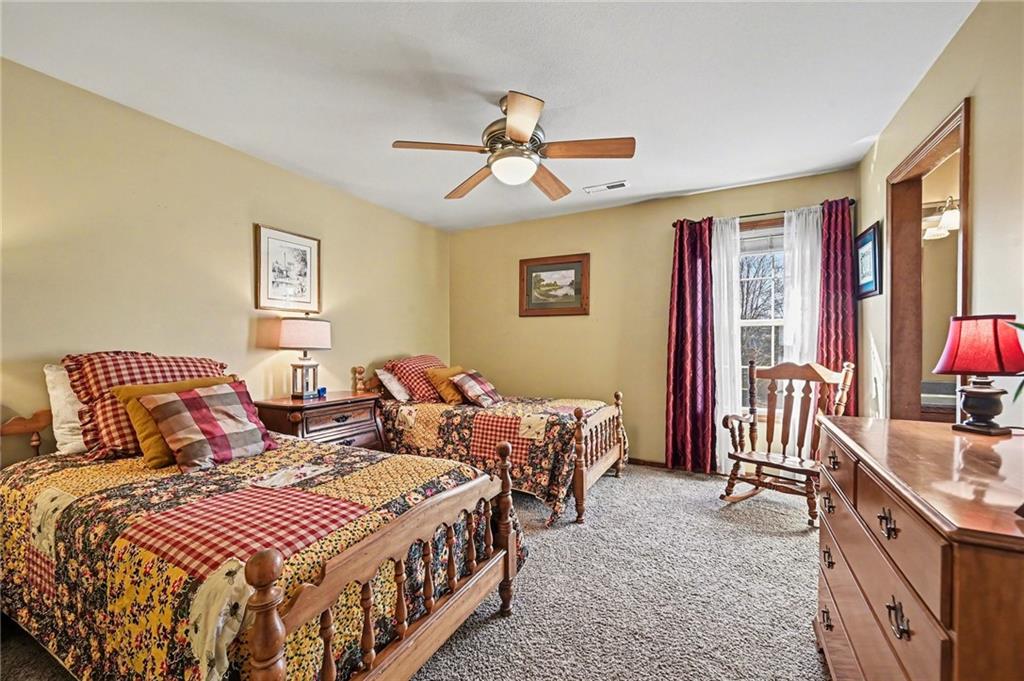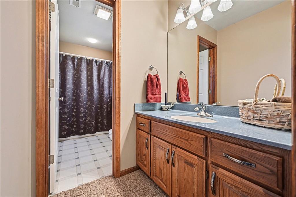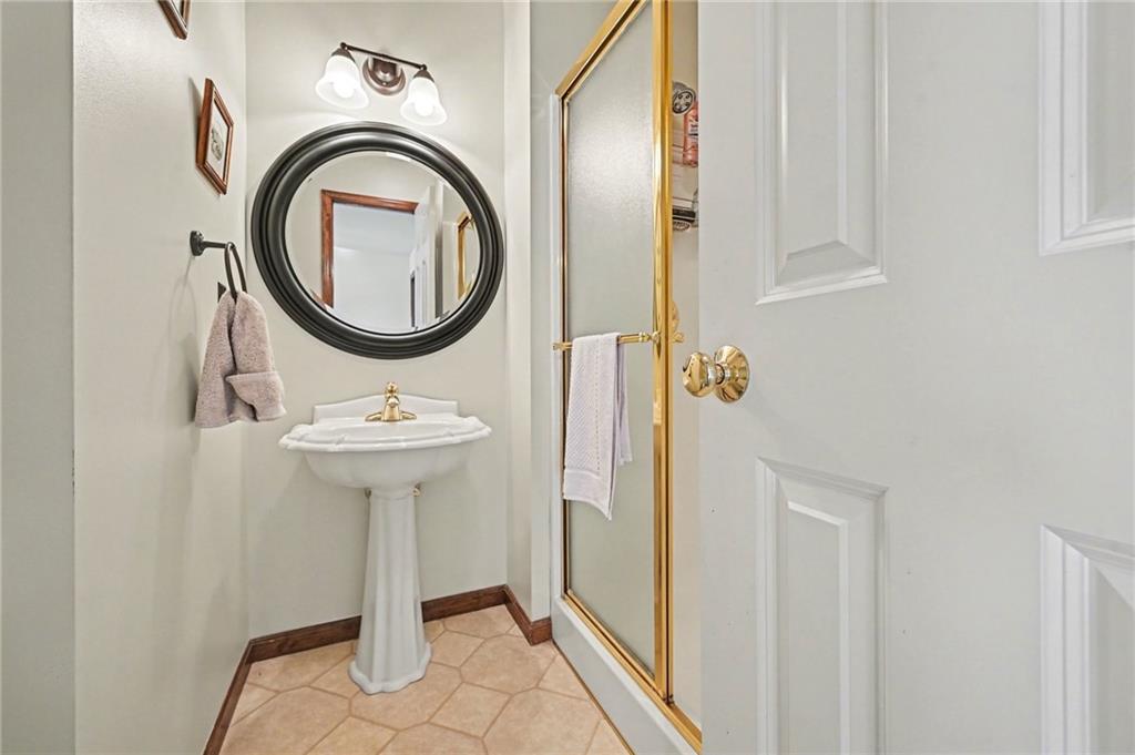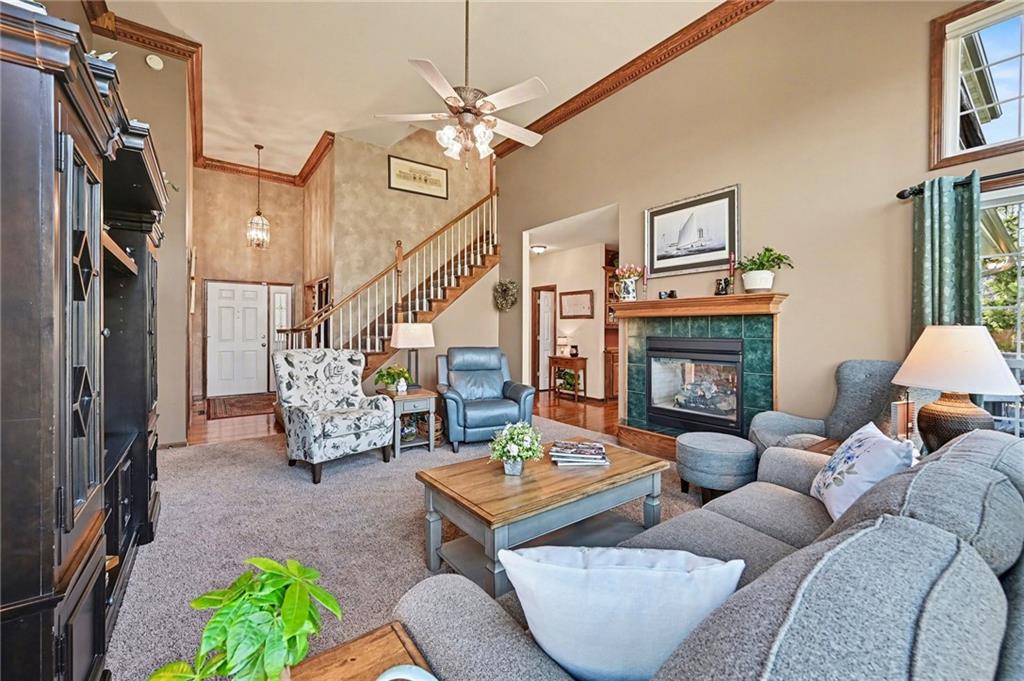 Stunning 1.5-story home in the highly desirable Lakes of Oakmont, ideally situated on a quiet cul-de-sac and featuring a welcoming covered front porch, spacious 3-car garage, plus an additional rear garden garage. This beautifully maintained home offers exceptional quality and thoughtful upgrades throughout. The main level features a spacious living room, formal dining room, and a well-appointed kitchen with solid surface countertops, pantry pull-outs, built-in buffet, and a beautiful see-through fireplace shared between the eat-in kitchen and living room. Also on the main level are the primary suite, laundry room, and convenient half bath for true main-level living. The primary bathroom offers heated floors, creating a spa-like retreat you’ll appreciate every day. Upstairs includes three generously sized bedrooms, two full bathrooms with direct access from each bedroom, providing comfort and privacy for family or guests. The finished walkout lower level is ideal for entertaining with a large family room, custom built-ins, wet bar area, and a dedicated office that could easily serve as a fifth bedroom, along with a full bath, spacious storage room, and convenient access to the rear garden garage—perfect for lawn equipment, a small vehicle, hobbies, or workshop space, and even includes an additional oven. Outdoor living is just as impressive with a covered patio, full-yard sprinkler system, routine pest control services, and an electric awning over the back deck for shaded relaxation. Major updates include a one-year-old roof and a new garage door opener featuring battery backup.