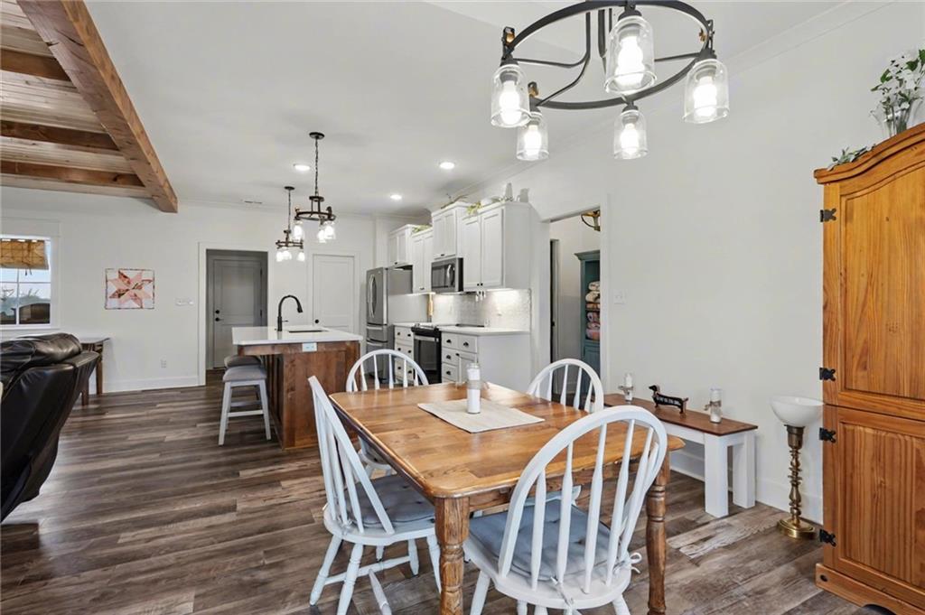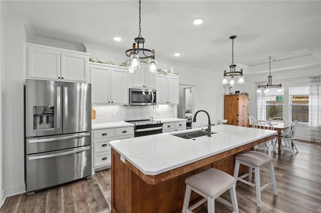 Welcome to this truly well maintained, one-level living home offering 3 spacious bedrooms and 2 bathrooms on a beautiful lot! This home features an inviting open floor plan highlighted by tall, wood planked ceilings, beautiful beams, and an abundance of natural light throughout. The large, open living room is great for entertaining or perfect for a cozy gathering around the gas fireplace. The stunning kitchen has ample cabinets, generous counter tops for culinary space, a huge pantry, and opens to the dining room. The spacious primary bedroom is complete with an ensuite bathroom including walk-in shower, double sink vanity, and large walk-in closet. The laundry room, with cabinets for extra storage, utility sink, and built-in ironing board, has access to the finished storm shelter. Step outside to the beautiful lot with detailed landscaping and thoughtful design, perfect for relaxing, entertaining, or simply enjoying the peaceful outdoor setting. Let’s not forget the covered patio, stunning pergola, and adorable custom shed. This property has zero-entry access (no steps into the home from the front door, back door, or garage), mud room, and 3 car garage with temporary wall allowing for home and lawn storage. Located near the neighborhood fishing pond and park, in quaint Baldwin City, and within an easy commute to Lawrence, KC, Eudora, Ottawa and surrounding. With its pristine condition, custom upgrades, and stunning outdoor space, this property is the perfect place to call home. **Seller is building a home and cannot close/move until the new construction is fully completed - estimated completion date is mid-May, weather permitting**.