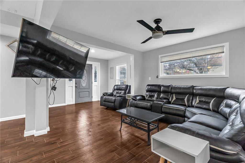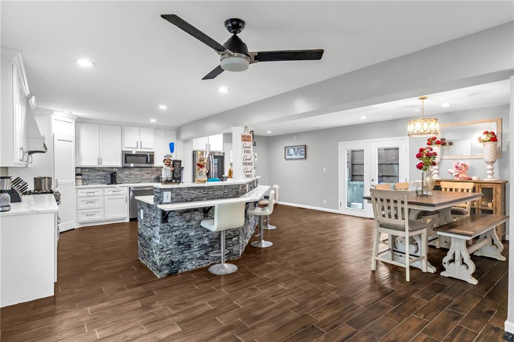 This spacious 5 bedroom, 2.5 bathroom home in Kansas City, KS offers over 3,200 square feet of versatile living space and a layout designed for comfort and flexibility. A long driveway leads to the detached 2-car garage, providing ample parking and convenience. The main level features an open concept living, dining, and kitchen area that feels bright and welcoming. The beautifully updated kitchen is the heart of the home, complete with a large island offering plenty of seating, abundant cabinet space, and a generous pantry for extra storage. The dining area is large enough to accommodate a full-size table, making it perfect for everyday meals or hosting friends and family. A bedroom on the main floor provides great flexibility and could easily serve as a guest room or an office. Upstairs, you'll find an expansive private primary suite that takes up the entire level, creating a true retreat. This space includes a large bedroom along with a bonus den or sitting area that could be used as a home office, lounge space, or another living space. The finished basement adds even more functionality with a full second kitchen, making it ideal for entertaining, extended family living, or additional recreation space. With its generous square footage, open layout, and thoughtful updates, this home offers a unique opportunity for comfortable living with plenty of room to spread out.