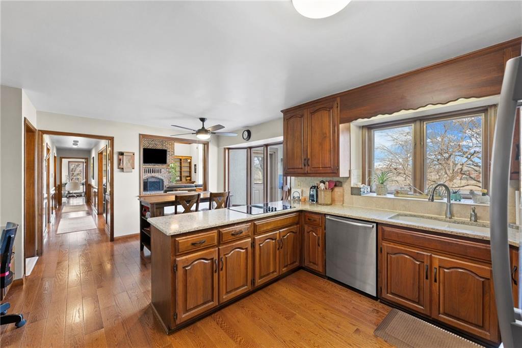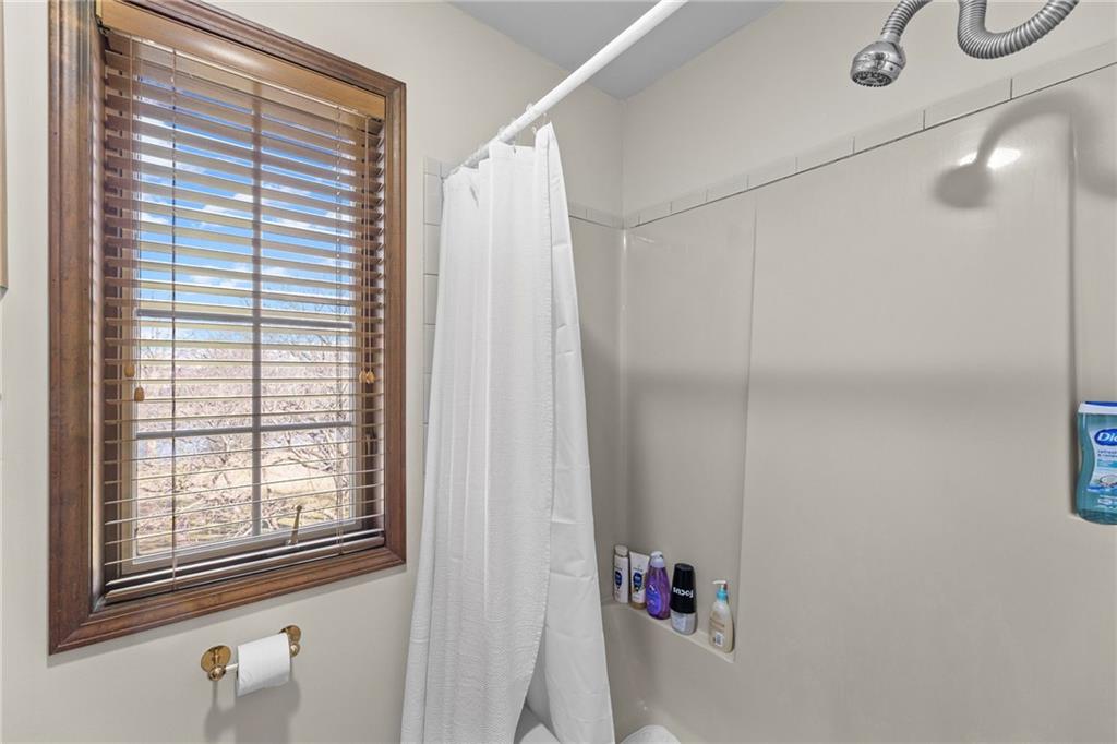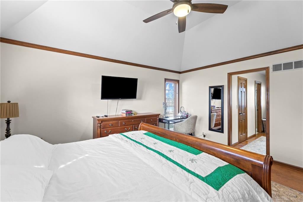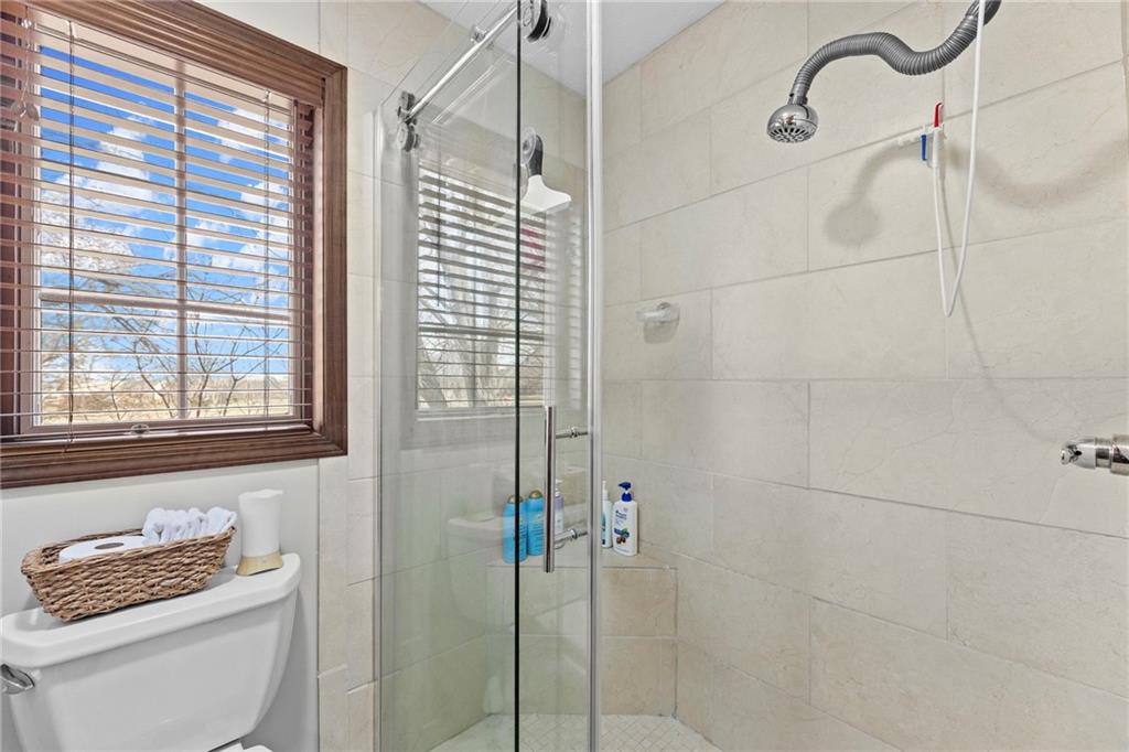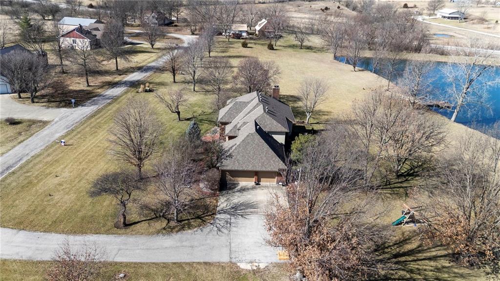 Nestled on 4.95 lush acres just north of the Paola Country Club, this exceptional custom-built 1.5-story residence offers a rare blend of superior craftsmanship and tranquil lakeside living. The heart of the home is a gourmet kitchen finished with rich walnut cabinetry, granite countertops, and warm oak hardwood floors, which flows seamlessly into a magnificent great room where walls of windows frame breathtaking views of a 2-3 acre stocked shared lake. Architectural integrity shines through the 6-inch wall construction, Anderson windows, and a high-impact resistant roof, while the interior showcases refined details like a custom-designed pecan study with solid core doors and two fireplaces. The main-floor primary suite serves as a private sanctuary with vaulted ceilings, walk-in closets, a shower and granite double vanities with Kohler fixtures. Upstairs, three additional spacious bedrooms share a beautifully updated full bathroom, ensuring comfort for family or guests. The versatile walkout lower level extends the living space with a bright family room, den, and a dedicated 24x13 workshop, all leading out to a sprawling yard, perfect for entertaining. Enjoy the fruit trees, blackberry bushes, strawberry and asparagus patches, plus a 30 ft. x 12 ft. garden area. Situated on a quiet dead-end road, this meticulously maintained brick frame and stone trim estate provides a serene escape without sacrificing proximity to local amenities.