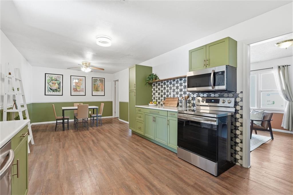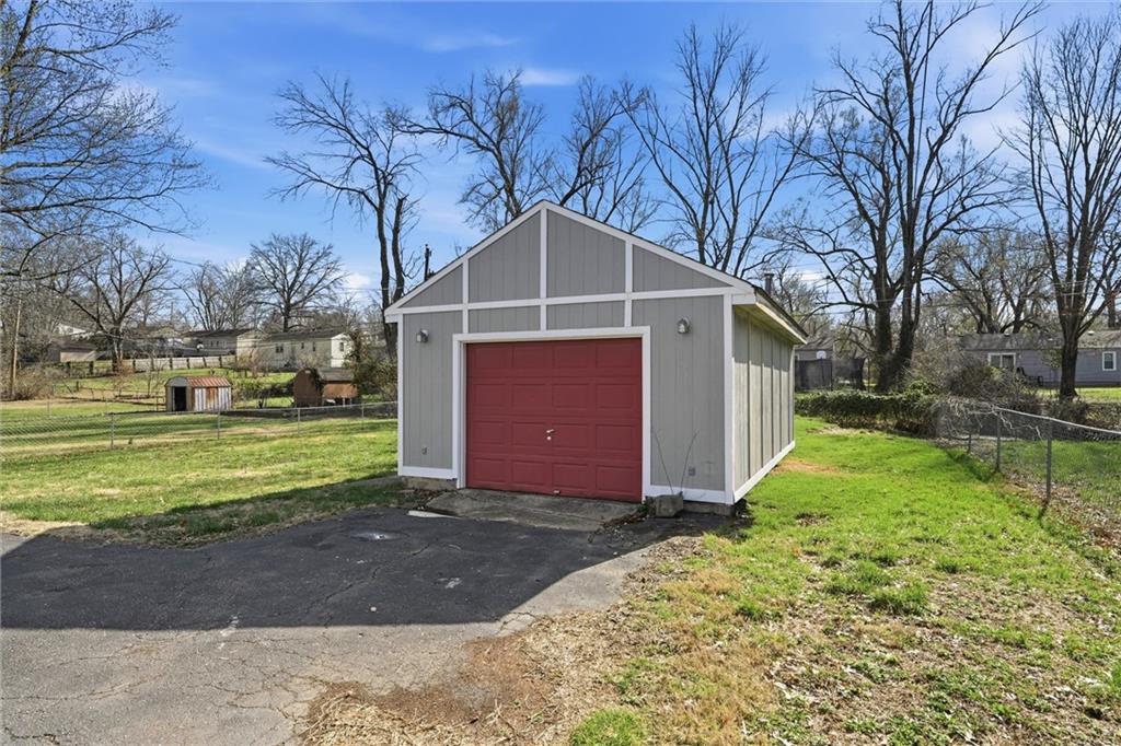Fully updated ranch offering true main level living just minutes from Longview Lake. This four bedroom, one bathroom home features spacious bedrooms and an oversized bathroom with a comfortable and functional layout. The updated kitchen includes a walk in pantry and flows conveniently to the main level laundry room located just off the kitchen. Updates throughout the home include fresh paint, updated finishes, and thoughtful design from floor to ceiling creating a bright and inviting living space. Outside you will find a double driveway with a double gate leading to the backyard and an oversized detached garage featuring a heated shop complete with shelving, work benches, and ample workspace. The large fenced backyard offers additional outdoor living space with a gazebo and greenhouse already in place. A rare opportunity to own a move in ready ranch home with a workshop, outdoor amenities, and convenient access to Longview Lake, parks, and nearby conveniences.