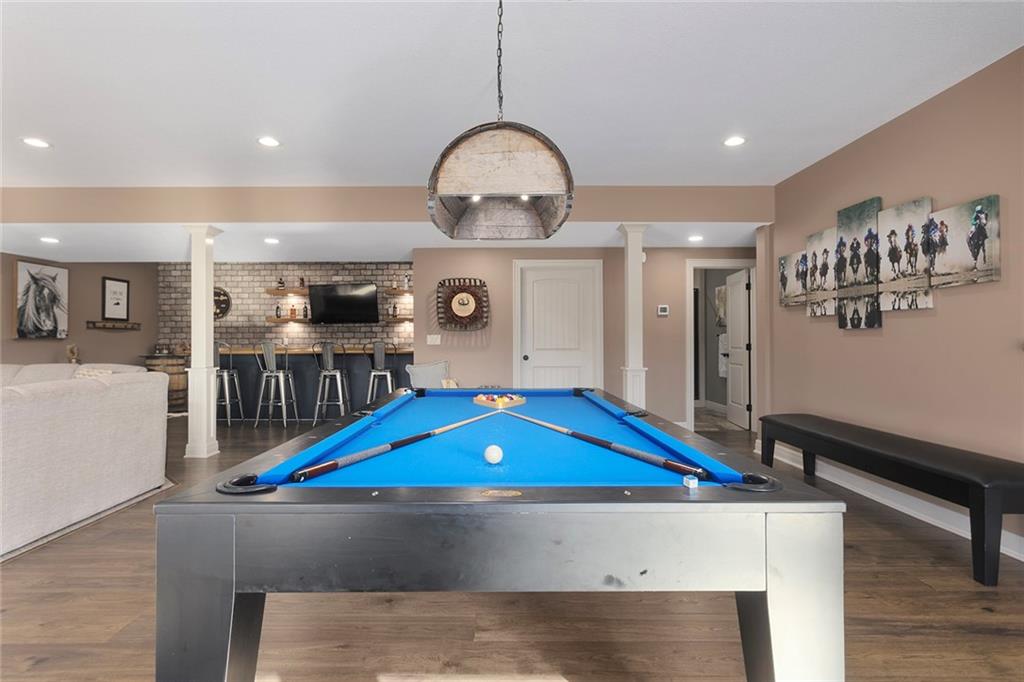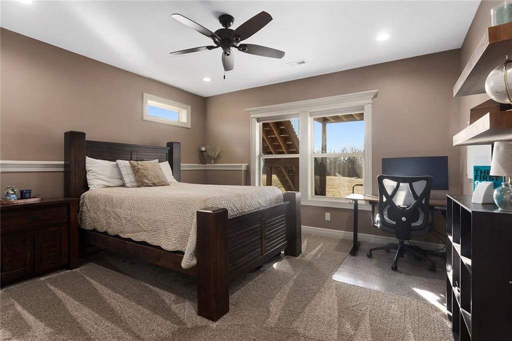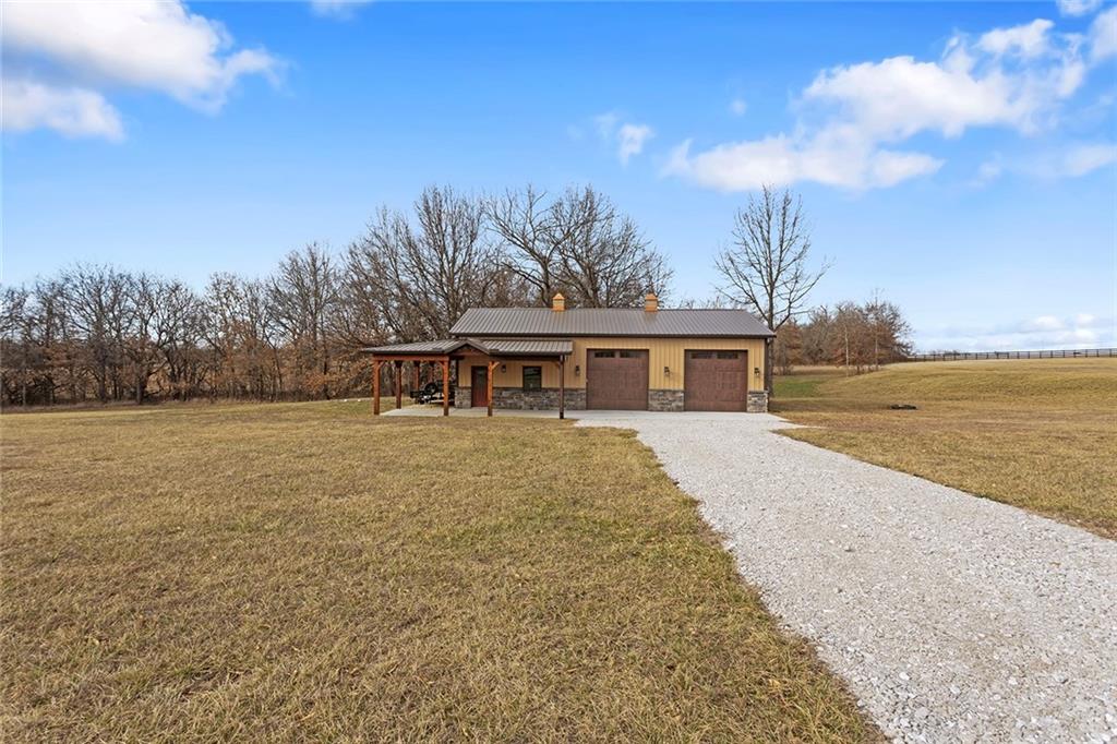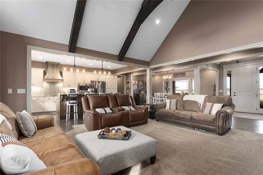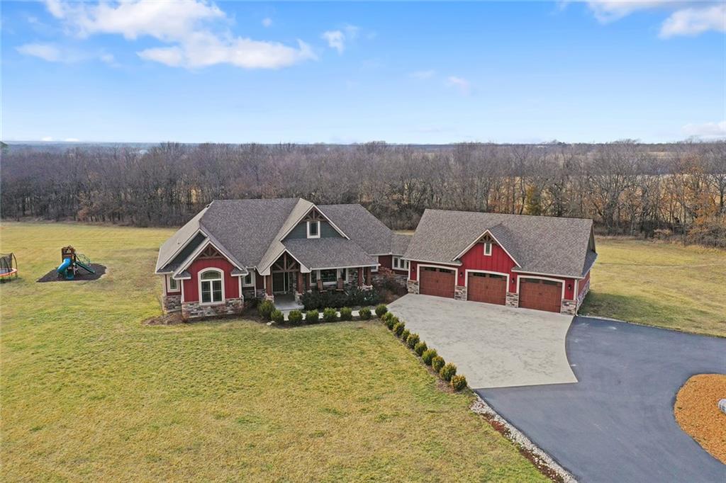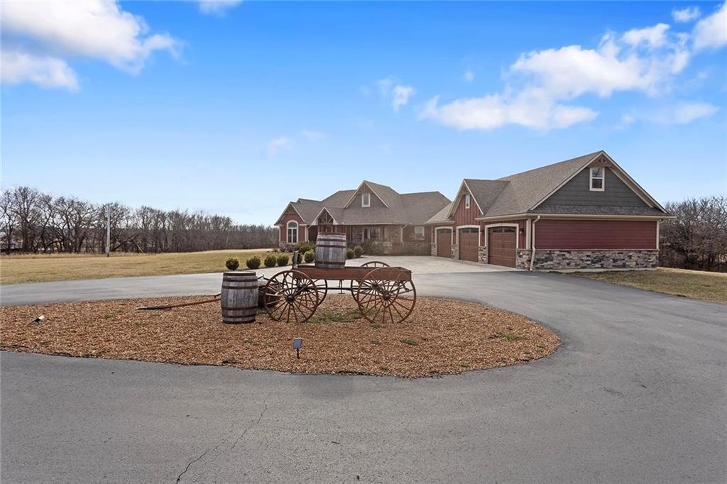 Welcome to Murricane Ranch — a private, gated estate where luxury meets the land. A winding paved drive lined with brilliant Fire Maples creates a breathtaking approach, setting the tone for nearly 25 pristine acres framed by classic Kentucky horse fencing and highlighted by a fully stocked pond. Designed to embrace the natural beauty and uniqueness of the property, this custom-built reverse 1.5-story captures sweeping treed views and unforgettable sunsets from its screened-in covered deck. Inside, the open-concept layout is anchored by a true chef’s kitchen featuring custom cabinet detailing and an amazing walk-in pantry built for both serious cooking and seamless organization. The kitchen flows effortlessly into the main living areas, creating a warm and inviting space ideal for everyday living & entertaining. A thoughtfully designed main-floor pet/mud room adds convenience and function. The private owner’s retreat is a sanctuary of its own, complete with heated floors and a spa-quality shower that elevates daily living. Guest rooms are intentionally positioned for privacy, while the full walkout lower level offers two additional bedrooms, a spacious game room, wet bar, and dedicated media area. Quality construction is evident throughout, including zoned high-efficiency HVAC, engineered laminated floor joists, and a reinforced storm room for peace of mind. The absolutely massive heated 3 car garage (with over 1100 sq ft) accommodates even the largest vehicles with ease to maneuver and provides the option to finish a private apartment above. A 1,500-square-foot heated and cooled outbuilding with office space, bathroom, and an impressive man cave expands the lifestyle possibilities even further. Though privately tucked away, Murricane Ranch is just minutes to I-70 & approximately 20 minutes to Blue Springs—offering convenient access without sacrificing seclusion. This is more than a home; it is a purposefully crafted retreat where land, luxury, & lifestyle converge.