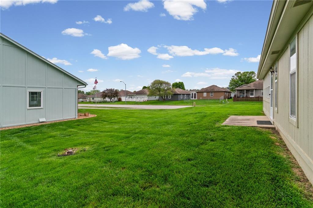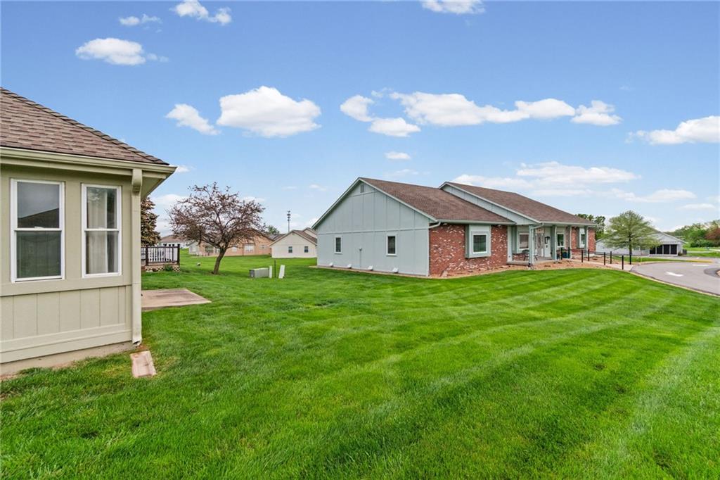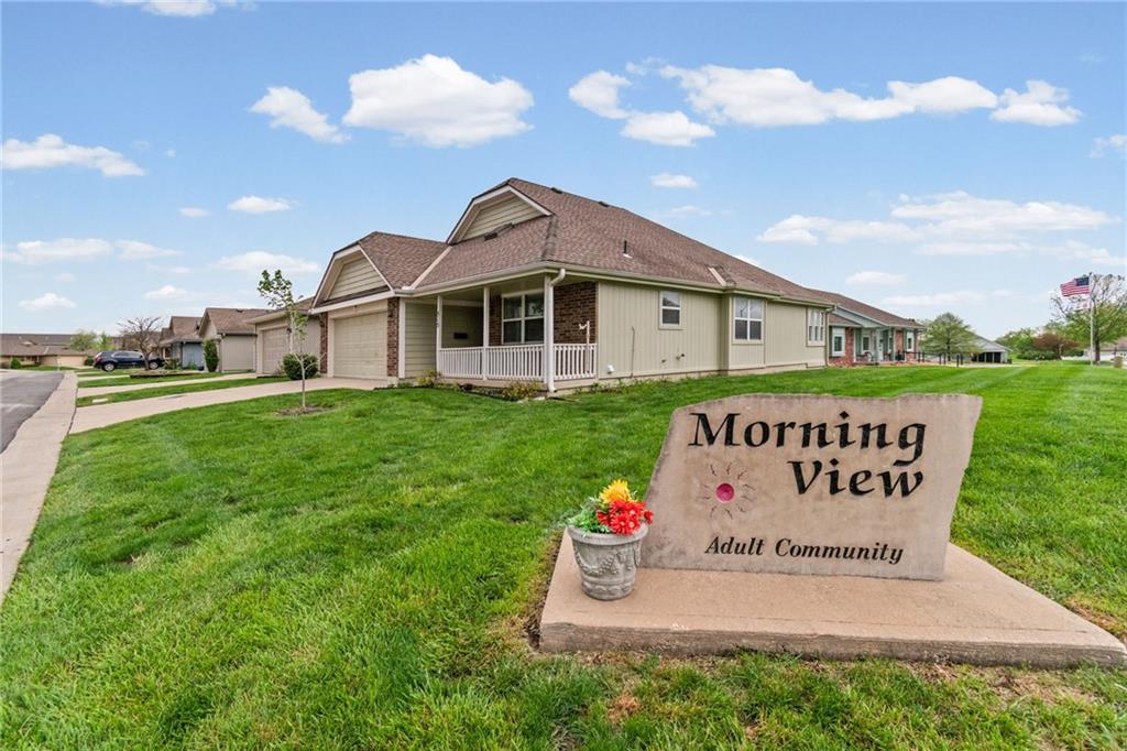Welcome to this stunning one-level home in the desirable Morningview subdivision in Raymore! Situated on one of the largest lots in the neighborhood, this spacious corner property backs directly to the clubhouse, offering both privacy and convenience. Step inside to experience true one-level living at its finest. The home features solid wood plank flooring throughout the main living areas and ceramic tile in the kitchen and bathrooms. The kitchen is beautifully appointed with granite countertops, and all appliances stay — making this home truly move-in ready. ALL NEW INTERIOR PAINT. THE YELLOW IN PICTURES IS GONE AND A NEUTRAL COLOR HAS BEEN PAINTED. Both bedrooms offer generous space and large walk-in closets, while the two full bathrooms provide comfort and functionality. Enjoy relaxing mornings or peaceful evenings in the sunroom just off the back of the home. With its oversized lot, premium location, and thoughtful finishes, this property is a rare find in Morningview. All measurements to be verified by buying agent.
