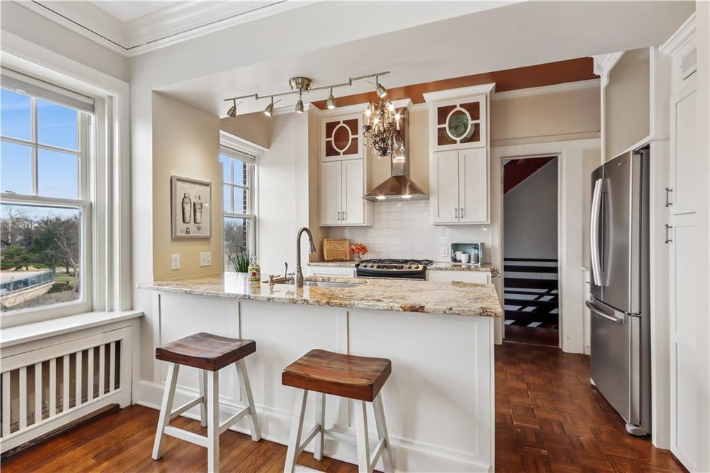 Fall in love with this beautifully updated 2-bedroom, 1-bath corner unit in the iconic Sophian Plaza. Flooded with natural light, this unit features rich hardwood floors, crown molding, and oversized windows with views in multiple directions. The updated kitchen is both stylish and functional, offering granite countertops, stainless appliances, a gas range, pantry, and spice cabinetry. Kitchen layout is open to the main living space, making it ideal for hosting or simply enjoying everyday life. The spacious primary bedroom is a wonderful retreat! Thoughtful touches like in-unit laundry and custom window treatments for convenience. Unlike many Plaza condos, the bedrooms are large enough to easily accommodate wardrobe pieces or armoires if someone wants additional closet space. Private basement storage included — perfect for seasonal items and extra belongings. Sophian residents enjoy a newly upgraded patio, private storage, secure exterior parking, and dues that include gas and water. Set in one of Kansas City’s most architecturally celebrated buildings, this location places you moments from the Country Club Plaza, Nelson-Atkins Museum of Art, parks, shopping, dining, and entertainment. If owning a piece of iconic architecture is on your bingo card for 2026, this one is worth it!