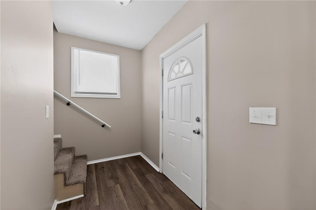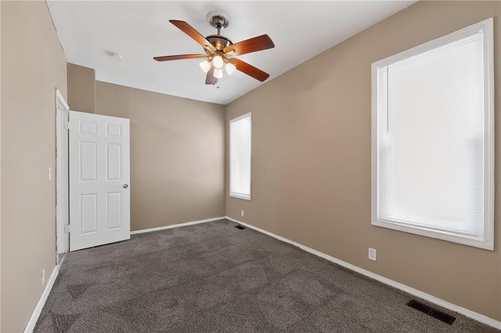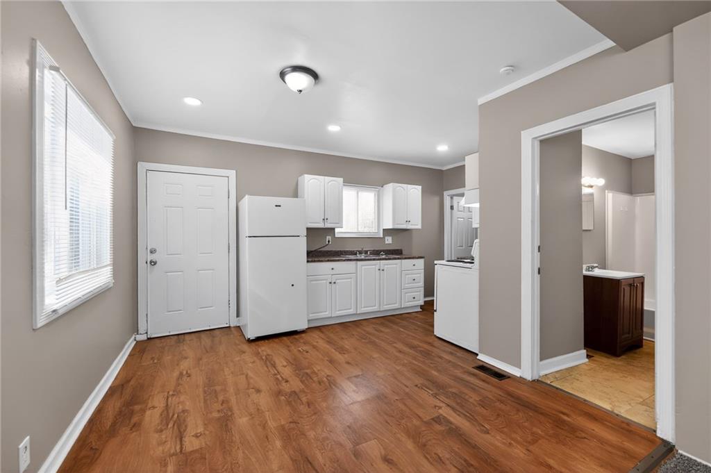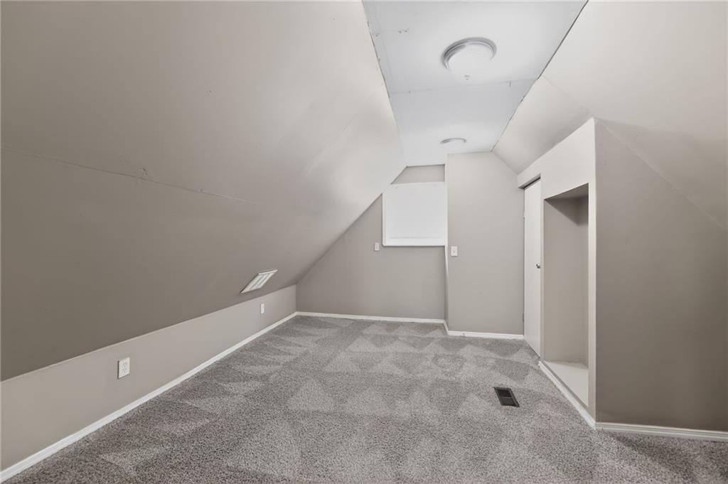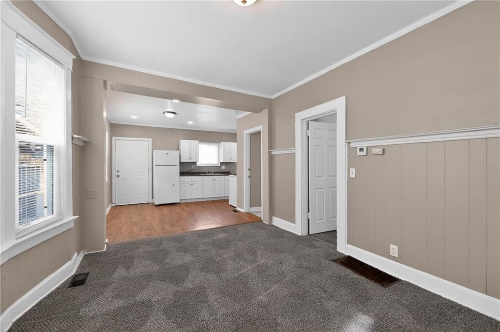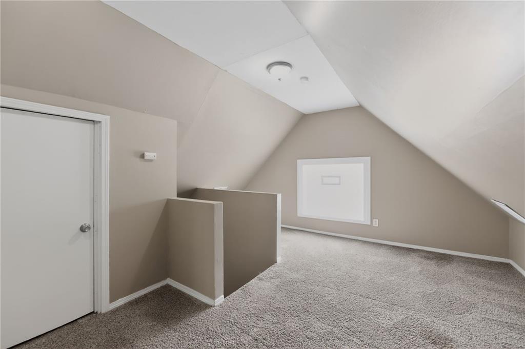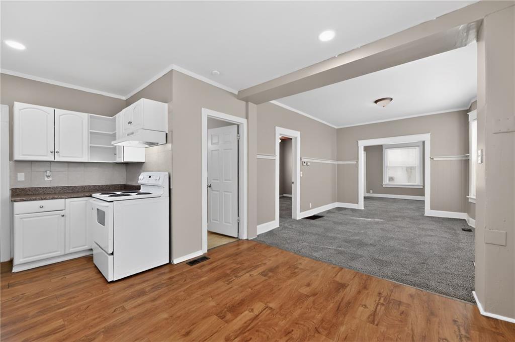 Lovely 1.5-story bungalow featuring a covered front porch and low-maintenance exterior siding, set on a level lot. Inside, the home offers a bright living area with neutral paint, white trim, and large windows that provide abundant natural light. The kitchen includes white cabinetry, laminate countertops, a double-basin sink, and white appliances, with adjacent space for dining. Carpeted bedrooms offer comfortable layouts, and the upper-level rooms feature vaulted ceilings and unique angles. Additional highlights include updated flooring in select areas, ample storage, and a functional floor plan that maximizes space throughout.